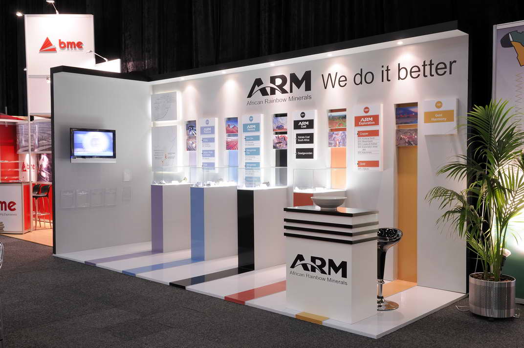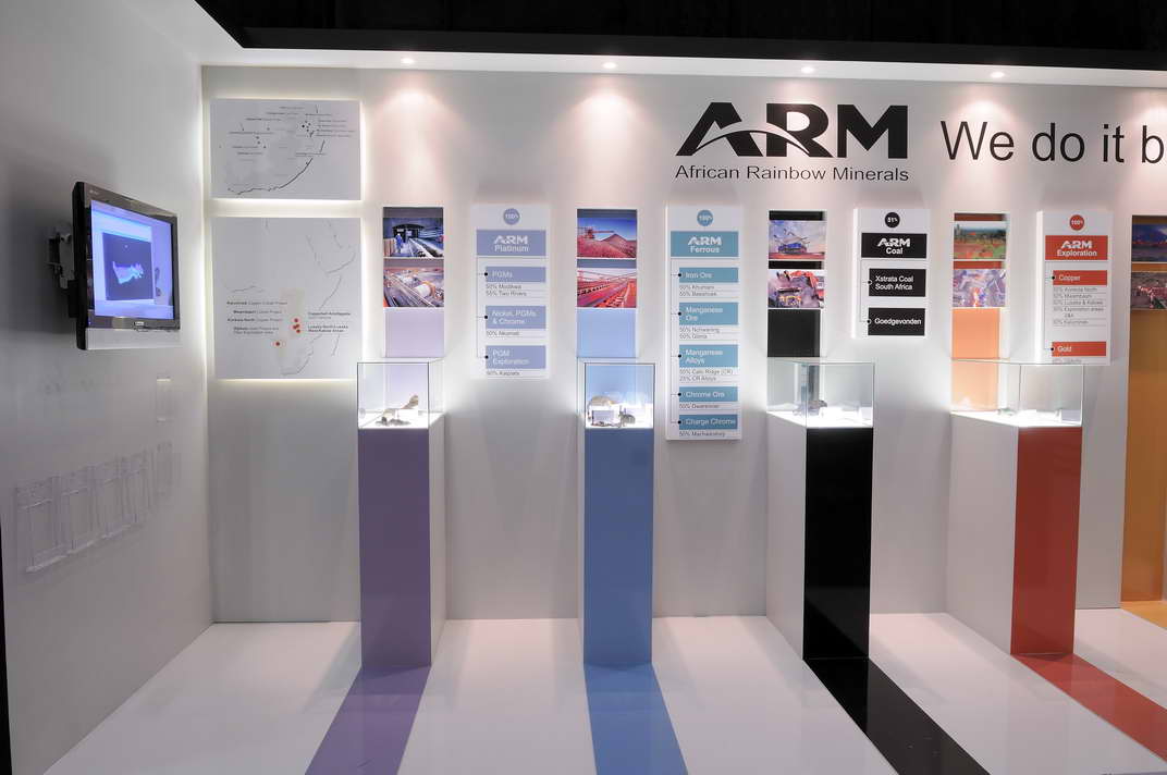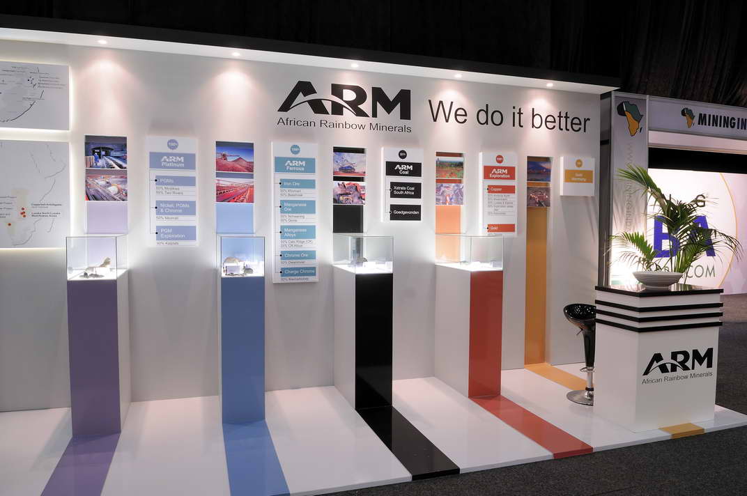 369 wurde beauftragt, einen maßgeschneiderten Messestand zu entwerfen und zu bauen für African Rainbow Minerals (ARM) auf der Mining Indaba, um eine saubere, strukturierte Umgebung zu schaffen, die sich auf die Präsentation des vielfältigen Mineralportfolios des Unternehmens konzentriert.