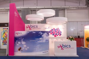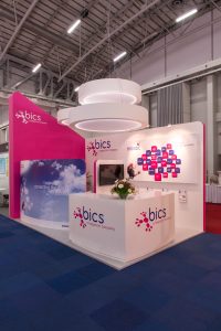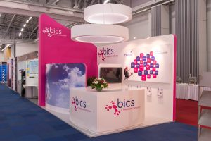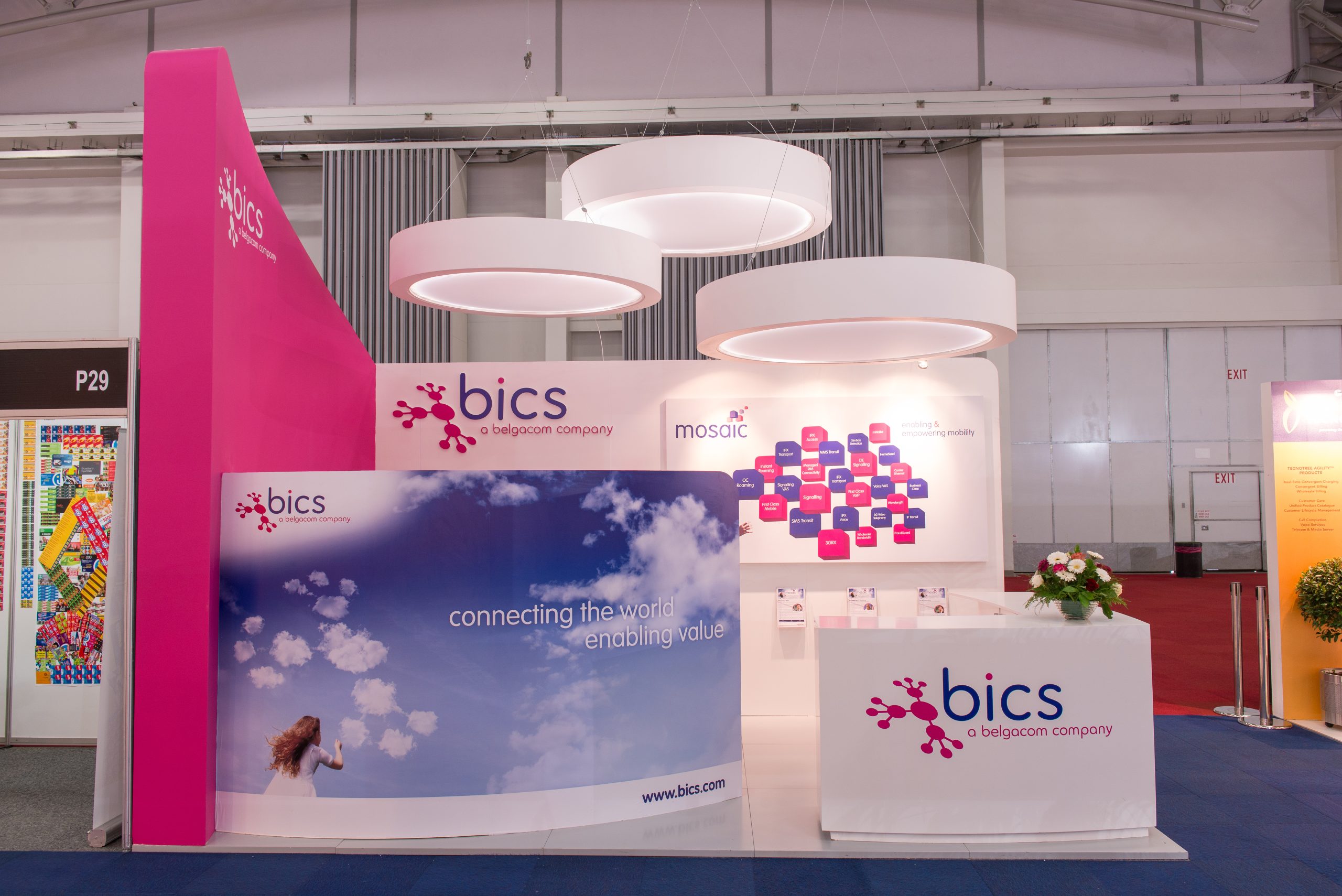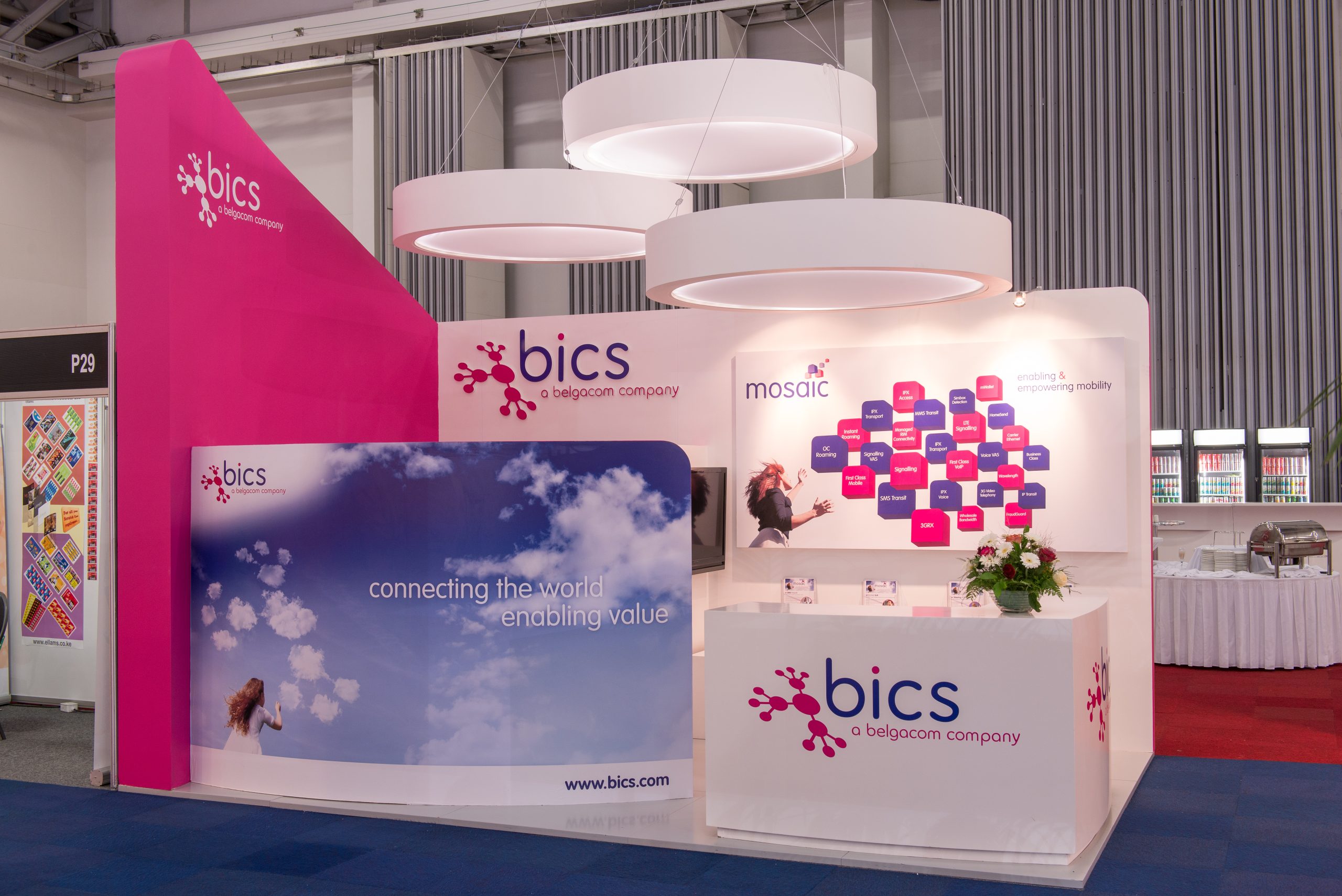 Entwickelt und gebaut für BICS (ein Unternehmen von Belgacom) an AfricaCom 2012, Dieser Messestand liefert eine markante, zeitgemäße Präsenz, die für den globalen Telekommunikationssektor maßgeschneidert ist. Das Design wird von starken architektonischen Formen und einem auffälligen Farbkontrast bestimmt, der leuchtend magentafarbene Elemente mit klaren weißen Oberflächen kombiniert, um eine hochgradig wiedererkennbare und ansprechende Markenatmosphäre zu schaffen.