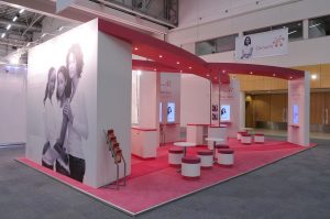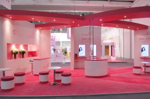 Der Stand war in einer klaren Rot-Weiß-Farbpalette gehalten, die die Markenidentität in eine kühne, aber strukturierte physische Umgebung übersetzte. Ein zentrales architektonisches Merkmal war die geschwungene Überkopfverkleidung, die integrierte Beleuchtung einschloss, um einen gleichmäßigen Umgebungsglanz zu erzeugen und gleichzeitig den gesamten Raum visuell zu verankern.