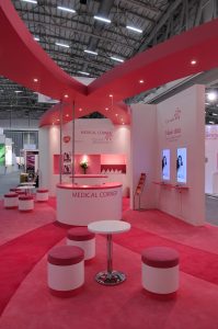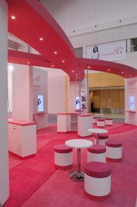 Das Layout war bewusst offen und zugänglich gestaltet und umfasste klar definierte Zonen wie einen zentralen Empfangsbereich, informelle Sitzbereiche und Punkte für digitales Engagement. Integrierte Bildschirme und Produktpräsentationen unterstützten die klare und professionelle Vermittlung medizinischer Informationen.