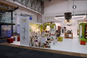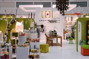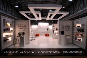 Dieser beeindruckende, mehrteilige Ausstellungsstand wurde für das Department of Trade and Industries gefertigt. Maßgefertigte Vitrinen beherbergten die South African Handmade Collection, beleuchtet mit LED-Licht von hinter dem Regal, was den Effekt eines Fotoshootings erzeugte.