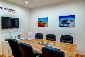 Embraer S.A. ist ein brasilianisches Luftfahrtkonglomerat, das Verkehrs-, Geschäfts- und Agrarflugzeuge herstellt. Der Kunde wünschte sich einen kleinen Besprechungsbereich und eine Kochnische, die für eine Veranstaltung in Johannesburg konzipiert wurden. Das blau-weiße Farbschema spiegelte die Marke Embraer wider, während hochwertiger Holzboden mit Ledersesseln Eleganz und Klasse verliehen.