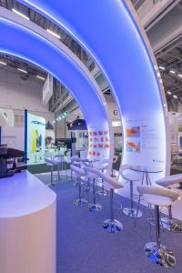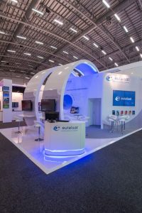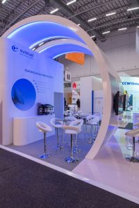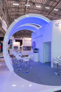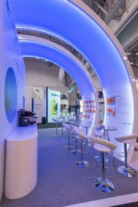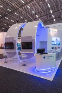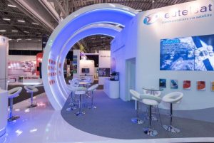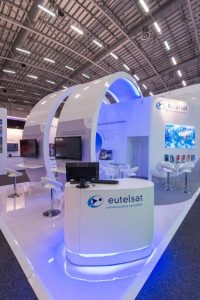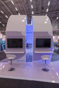Dieser auffällige Messestand nutzte glänzende weiße Materialien und LED-Beleuchtung mit blauen Akzenten, um die große Satellitenmarke auf ihrer Messe zu repräsentieren. LCD-Bildschirme zeigten Videos, während stilvolle Sitzecken und Erfrischungsstände eine geräumige, komfortable Umgebung für die Gäste boten.