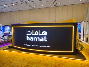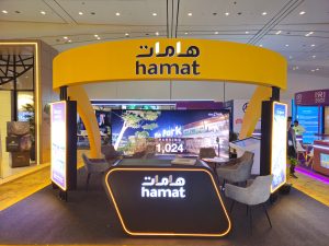 Diese Messestand nach Maß für Hamat an RECon MENA 2024 wurde entwickelt, um eine auffällige Präsenz im Einklang mit dem Fokus der Marke auf Lifestyle- und Einzelhandelsentwicklungen in Saudi-Arabien.