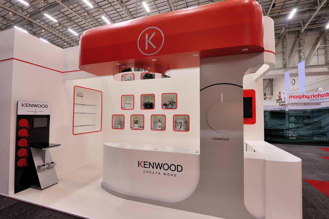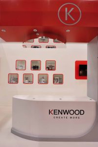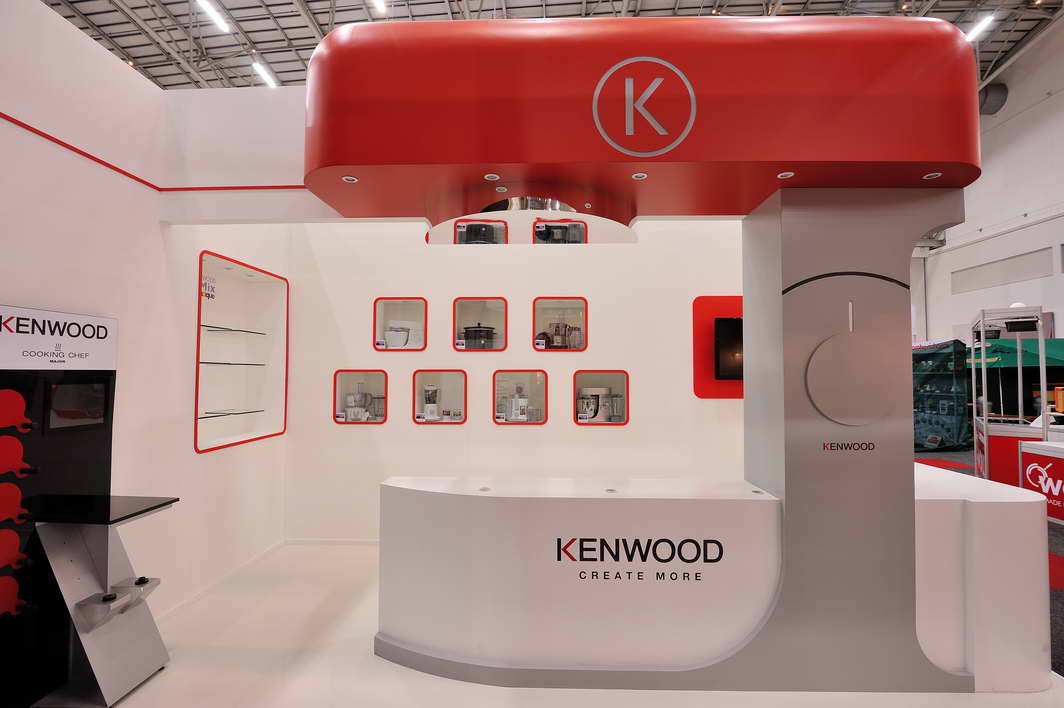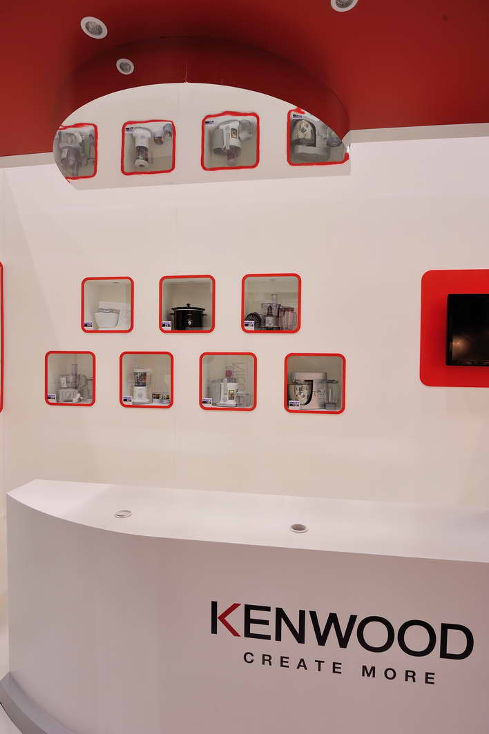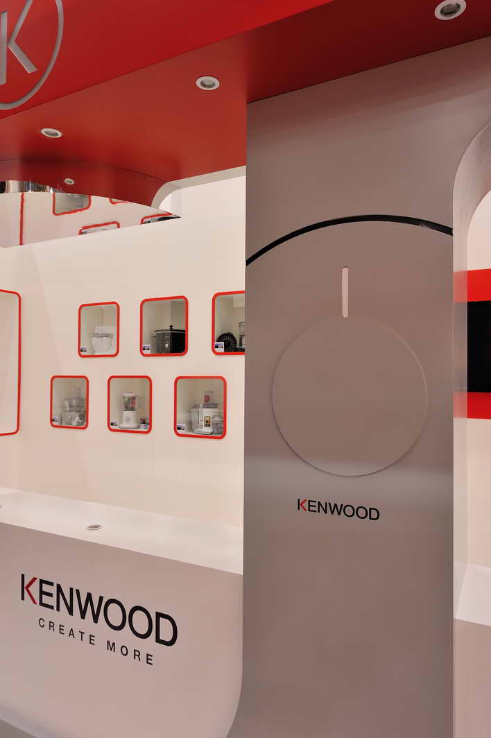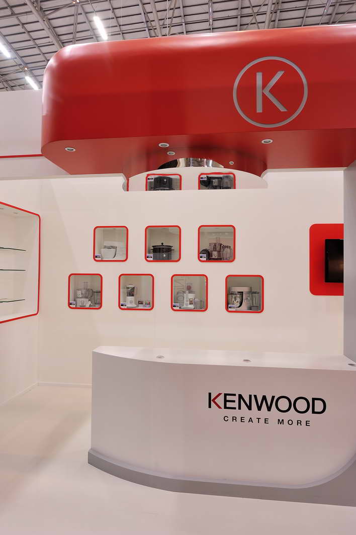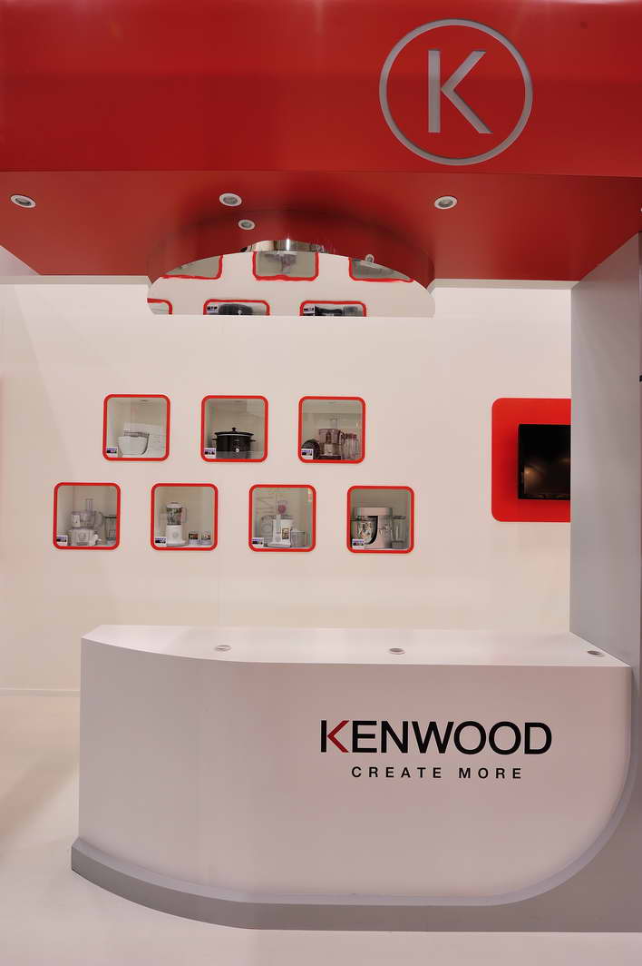 Das Design des Kenwood-Messestands integrierte einen riesigen Drehknopf in die Ausstellung, inspiriert vom Vorzeigeprodukt Kenwood Chef. Der Stand verfügt über einen erhöhten Boden, der mit weißem Laminat verkleidet ist, sowie beleuchtete Fenster, die Knöpfe darstellen und im Inneren die Kenwood-Produktpalette zeigen, die Besucher sehen und testen können.