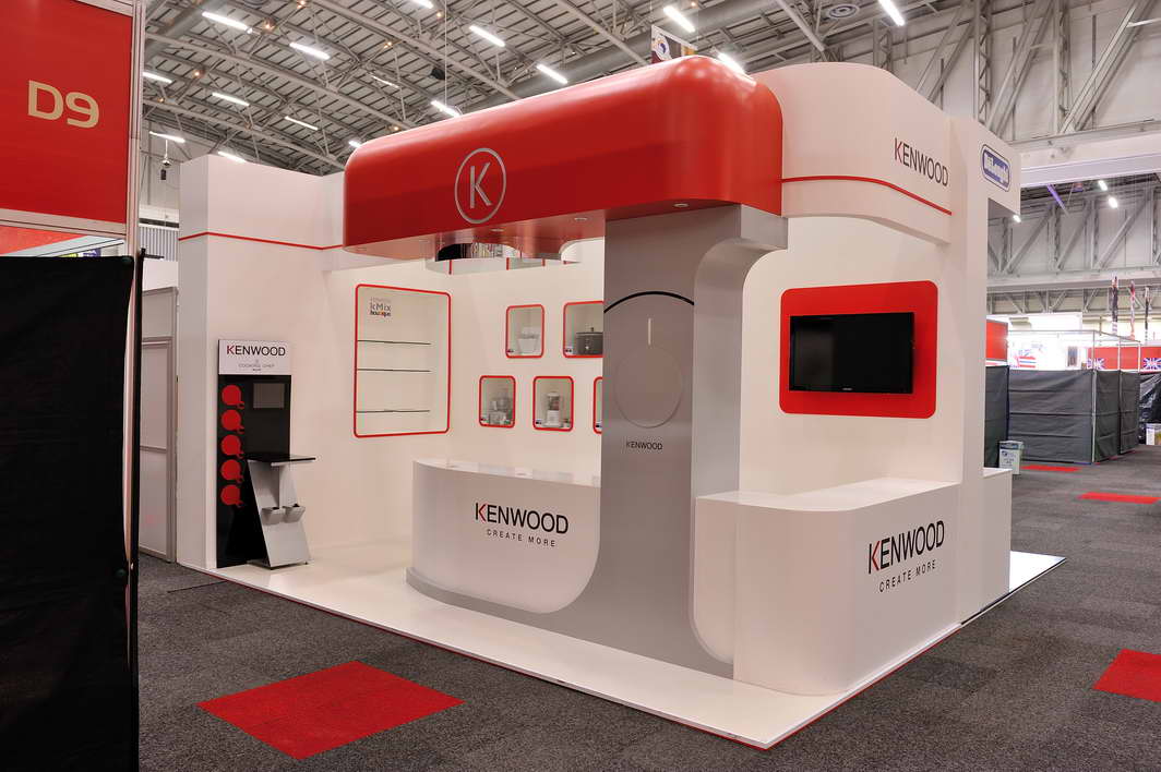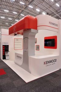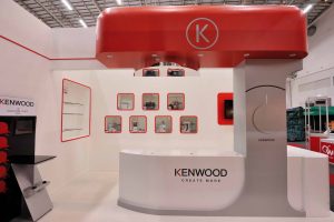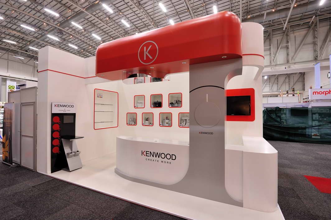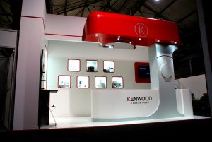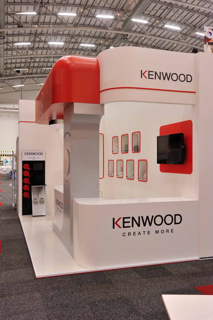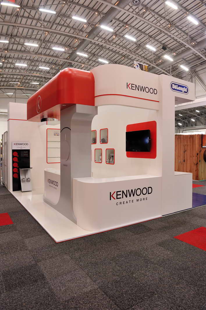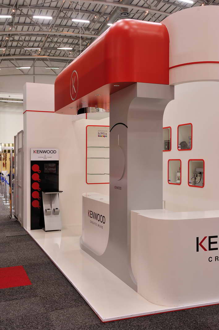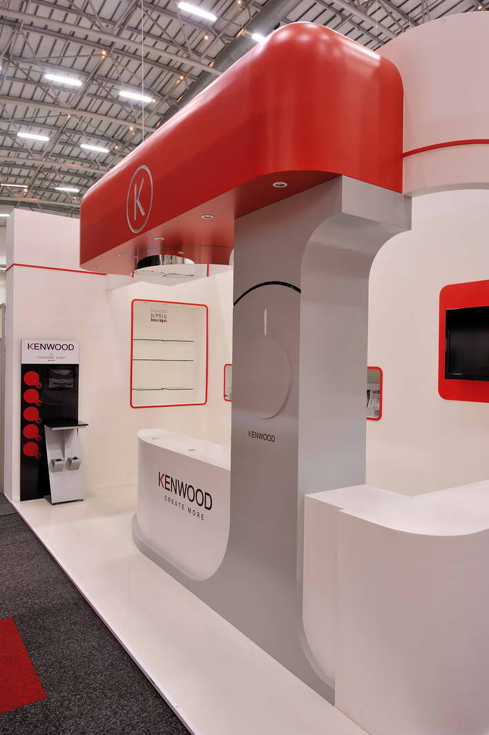 Das Design des Kenwood-Messestands integrierte einen riesigen Drehknopf in die Ausstellung, inspiriert vom Vorzeigeprodukt Kenwood Chef. Der Stand verfügt über einen erhöhten Boden, der mit weißem Laminat verkleidet ist, sowie beleuchtete Fenster, die Knöpfe darstellen und im Inneren die Kenwood-Produktpalette zeigen, die Besucher sehen und testen können.