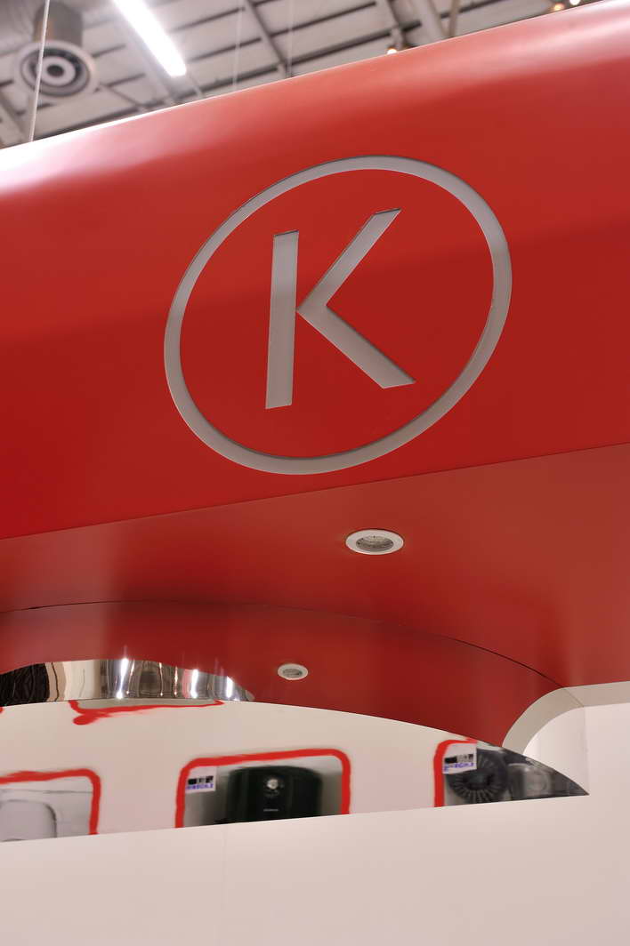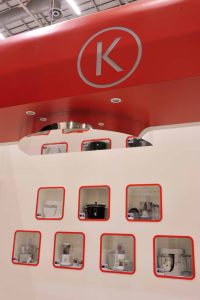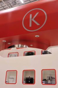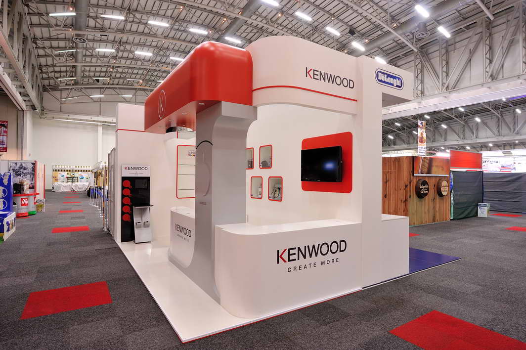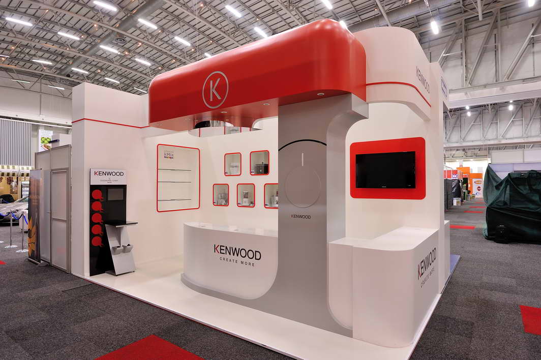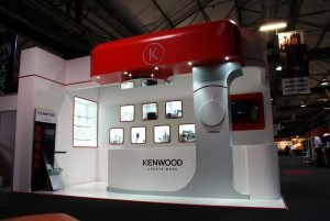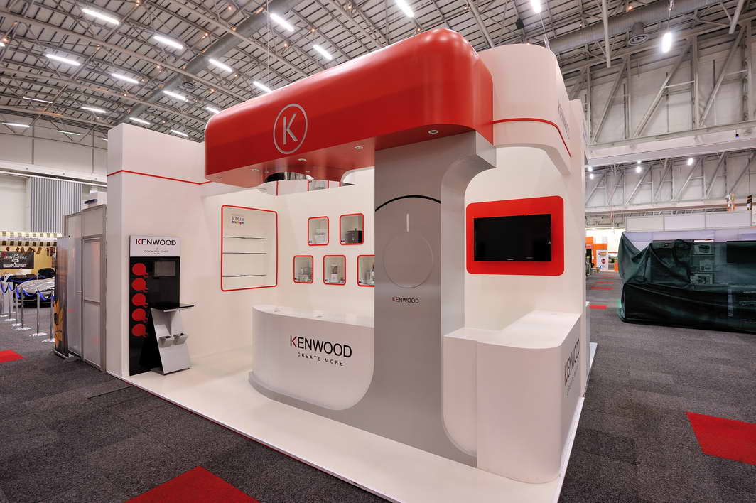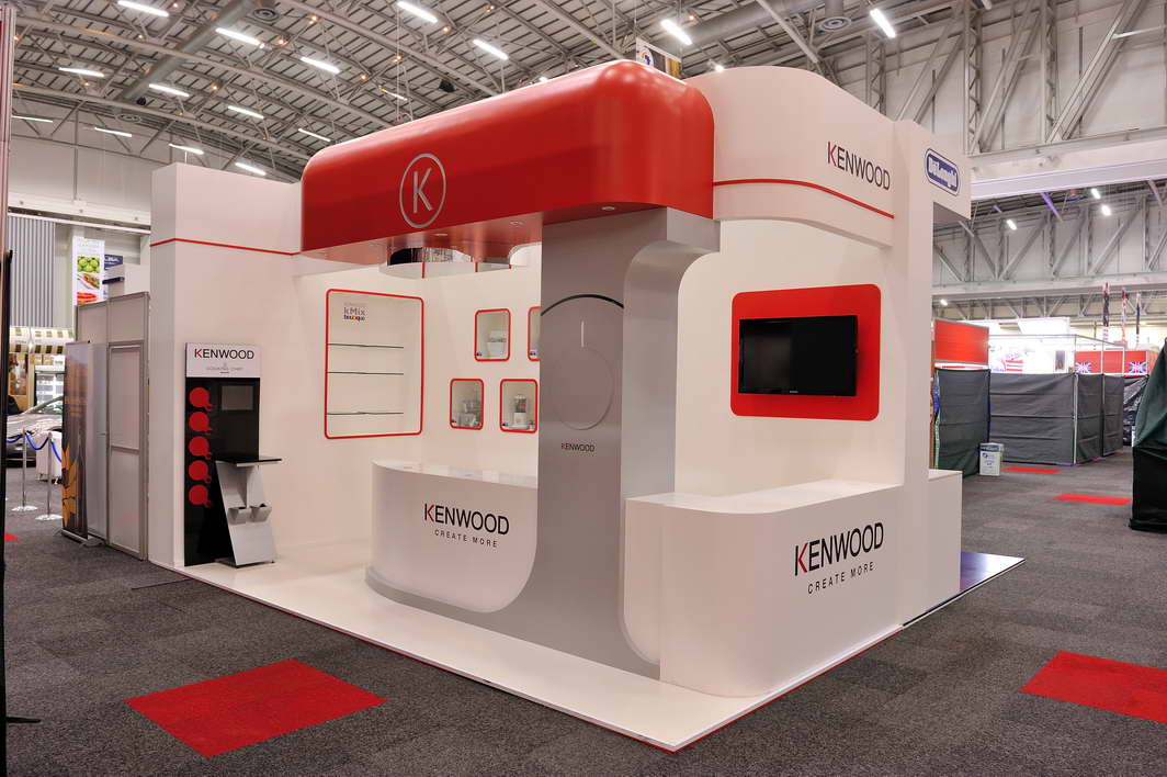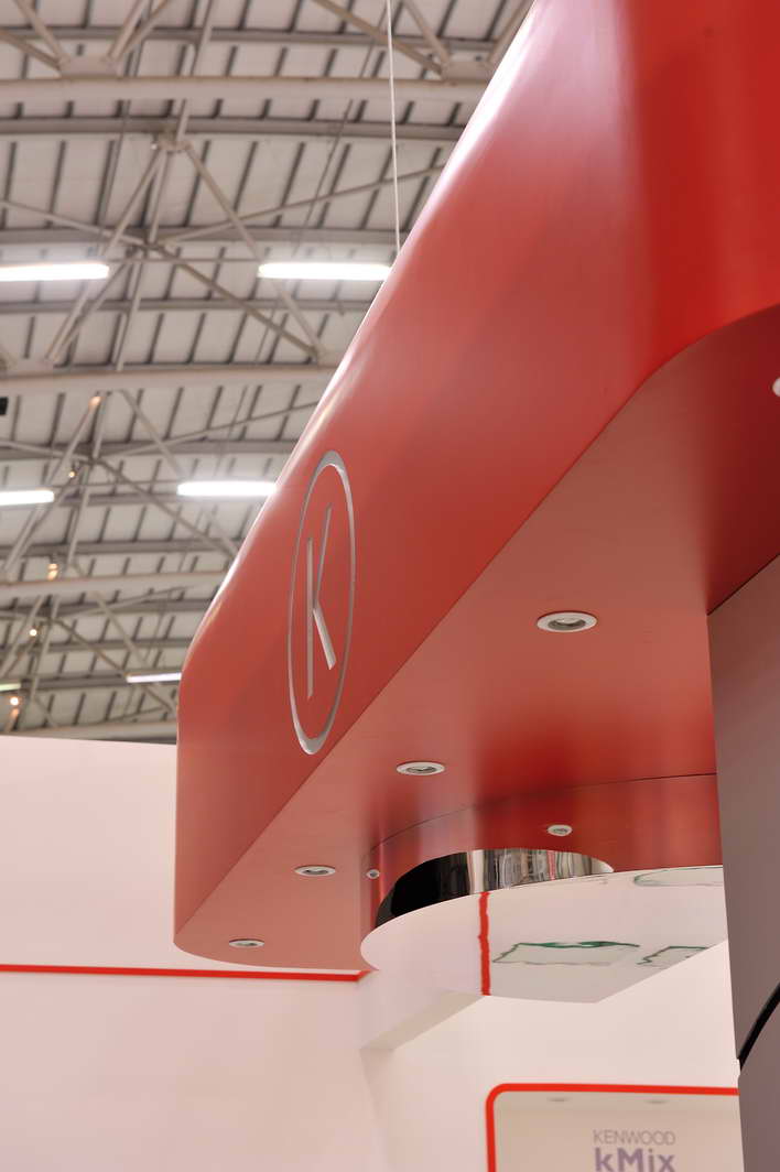 Das Design des Kenwood-Messestands integrierte einen riesigen Drehknopf in die Ausstellung, inspiriert vom Vorzeigeprodukt Kenwood Chef. Der Stand verfügt über einen erhöhten Boden, der mit weißem Laminat verkleidet ist, sowie beleuchtete Fenster, die Knöpfe darstellen und im Inneren die Kenwood-Produktpalette zeigen, die Besucher sehen und testen können.