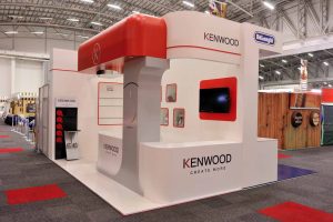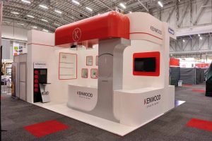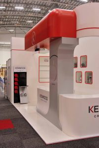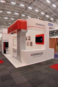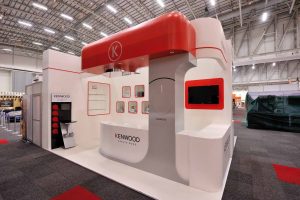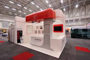 Ein markantes Überkopf-Element mit starker roter Markenpräsenz schuf hohe Sichtbarkeit im gesamten Messebereich, während das Gesamtdesign eine minimale, moderne Ästhetik das mit Kenwoods globaler Identität übereinstimmte.