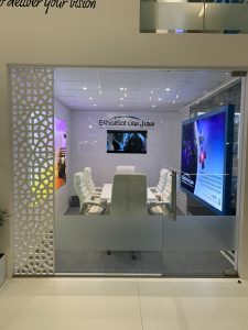 Das Erdgeschoss bot offene, zugängliche Bereiche mit integrierten digitalen Anzeigen und interaktiven Touchpoints, die das Besuchererlebnis förderten und gleichzeitig ein klares und professionelles Layout beibehielten. Geschlossene Glasbesprechungsräume boten eine kontrollierte Umgebung für Kundengespräche und gewährleisteten Privatsphäre, ohne die visuelle Offenheit zu beeinträchtigen.