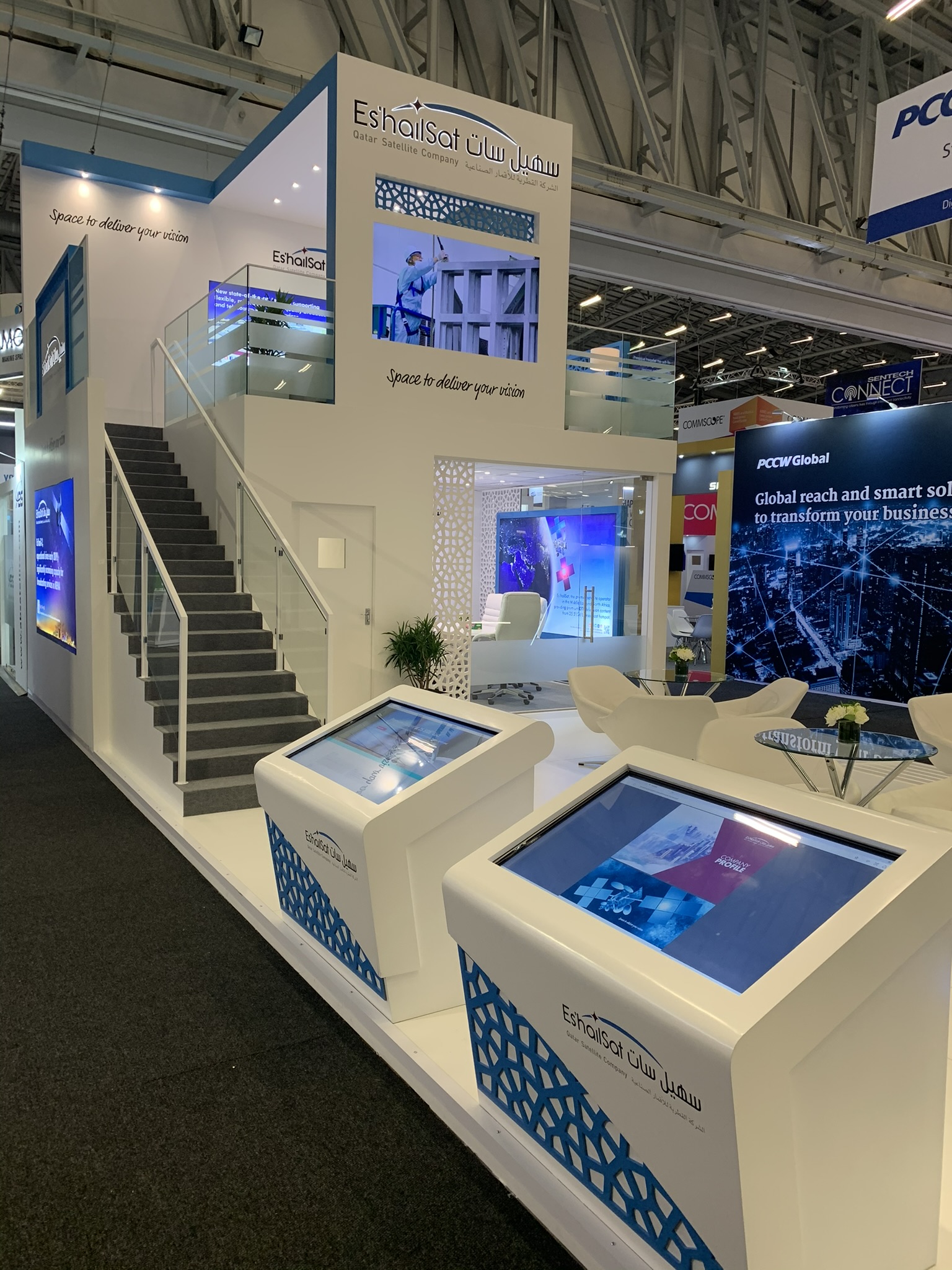 369 wurde ernannt von OP3 Global um einen individuell gefertigten Messestand für ihren Kunden zu liefern Es’hailSat (Katarischer Satellitenbetreiber) an AfricaCom.