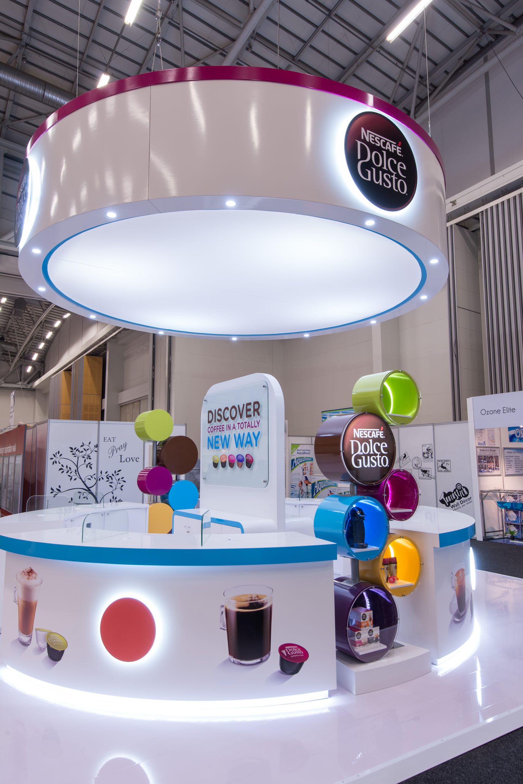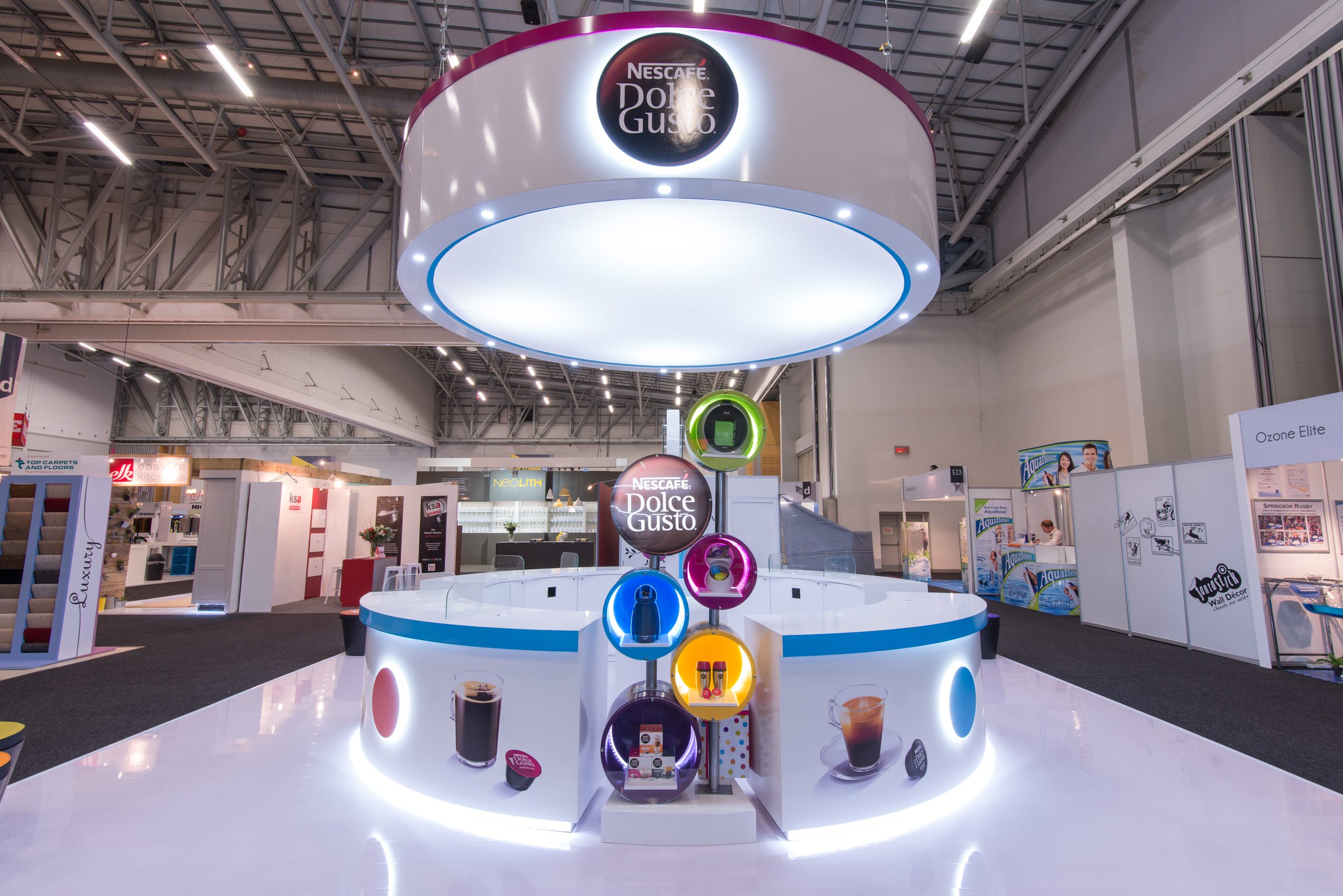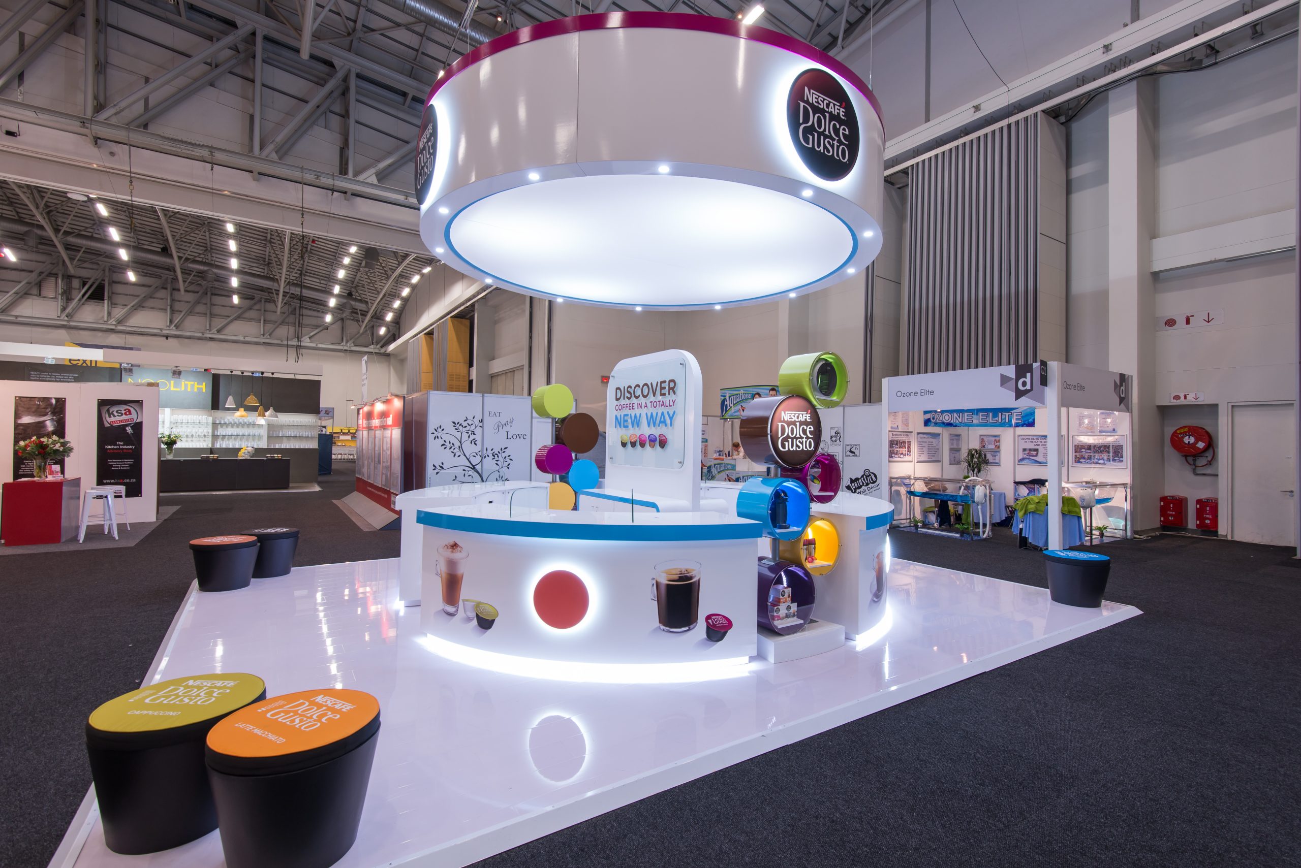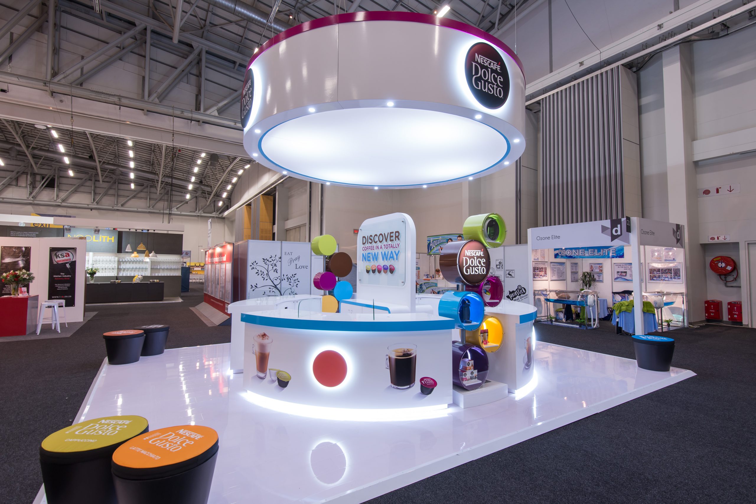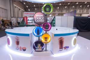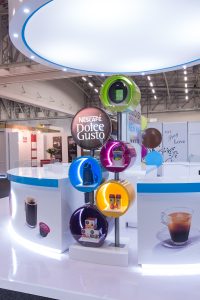 The Nestle Gusto stand’s bright and playful design was a pleasure to build. The island stand was built in a circular shape so as to allow visitors to gain access from any angel. The two custom round product display stands were made up to reflect the coffee pods as were the corner seats. The raised floor was coated with a high gloss finish as was the illuminated hanging bulkhead, giving the stand a luminous look and feel that contrasted well with the bright colours of the exhibition stand.