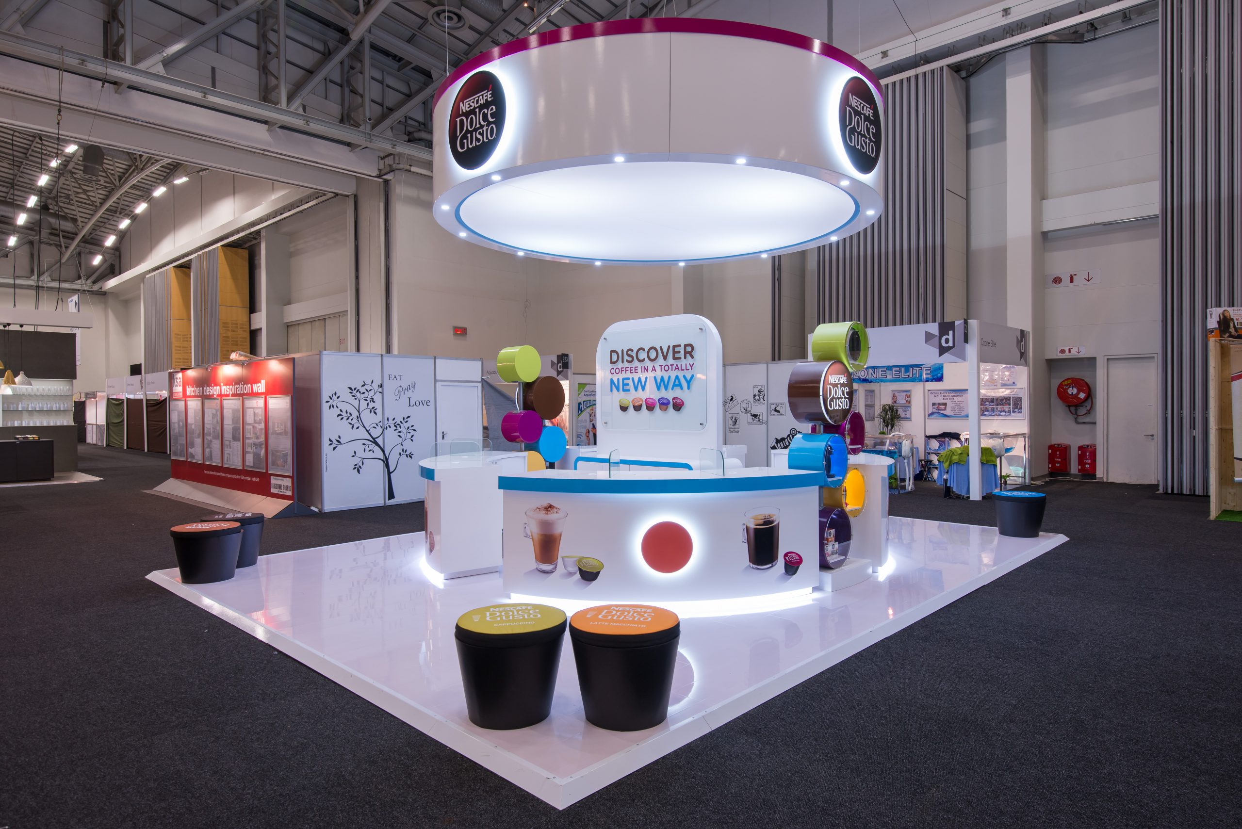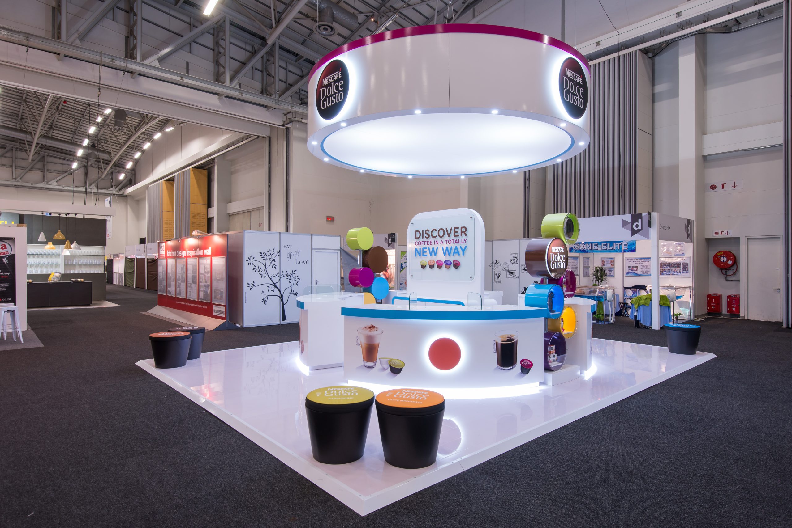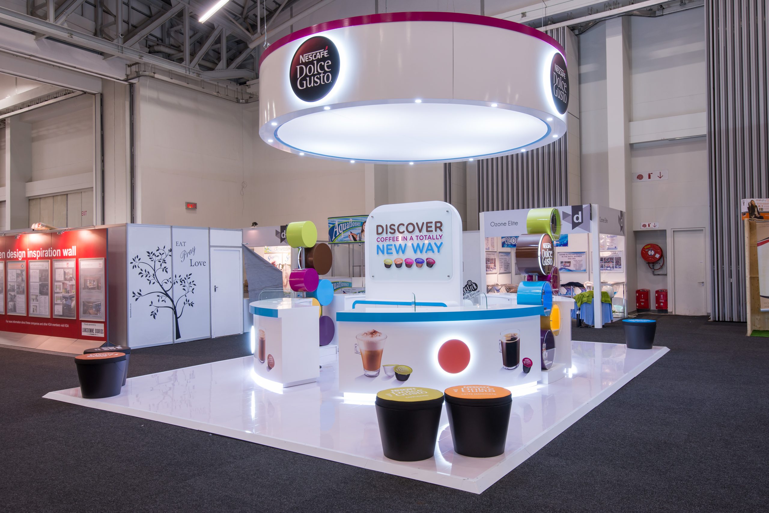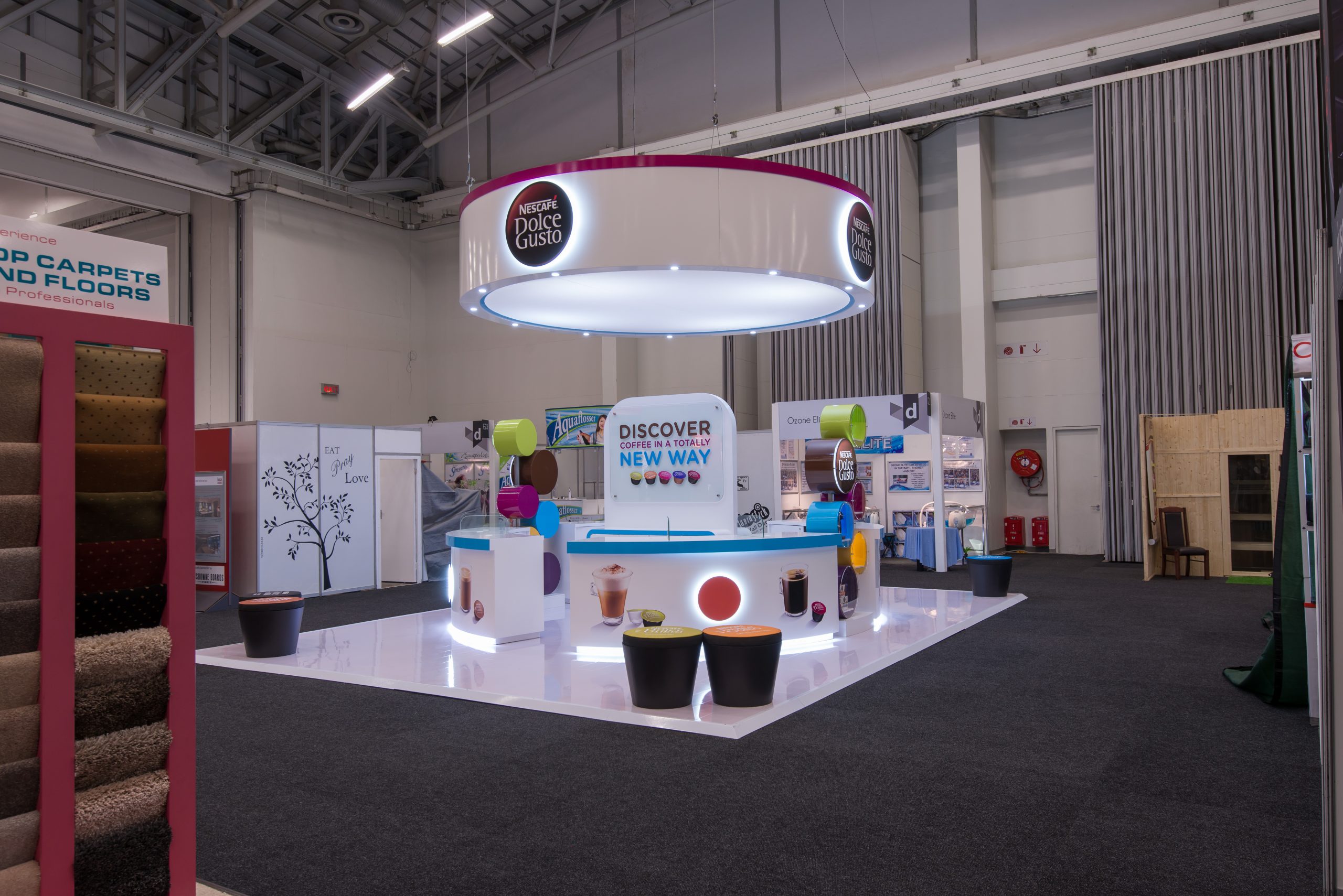 The Nestle Gusto stand’s bright and playful design was a pleasure to build. The island stand was built in a circular shape so as to allow visitors to gain access from any angel. The two custom round product display stands were made up to reflect the coffee pods as were the corner seats. The raised floor was coated with a high gloss finish as was the illuminated hanging bulkhead, giving the stand a luminous look and feel that contrasted well with the bright colours of the exhibition stand.