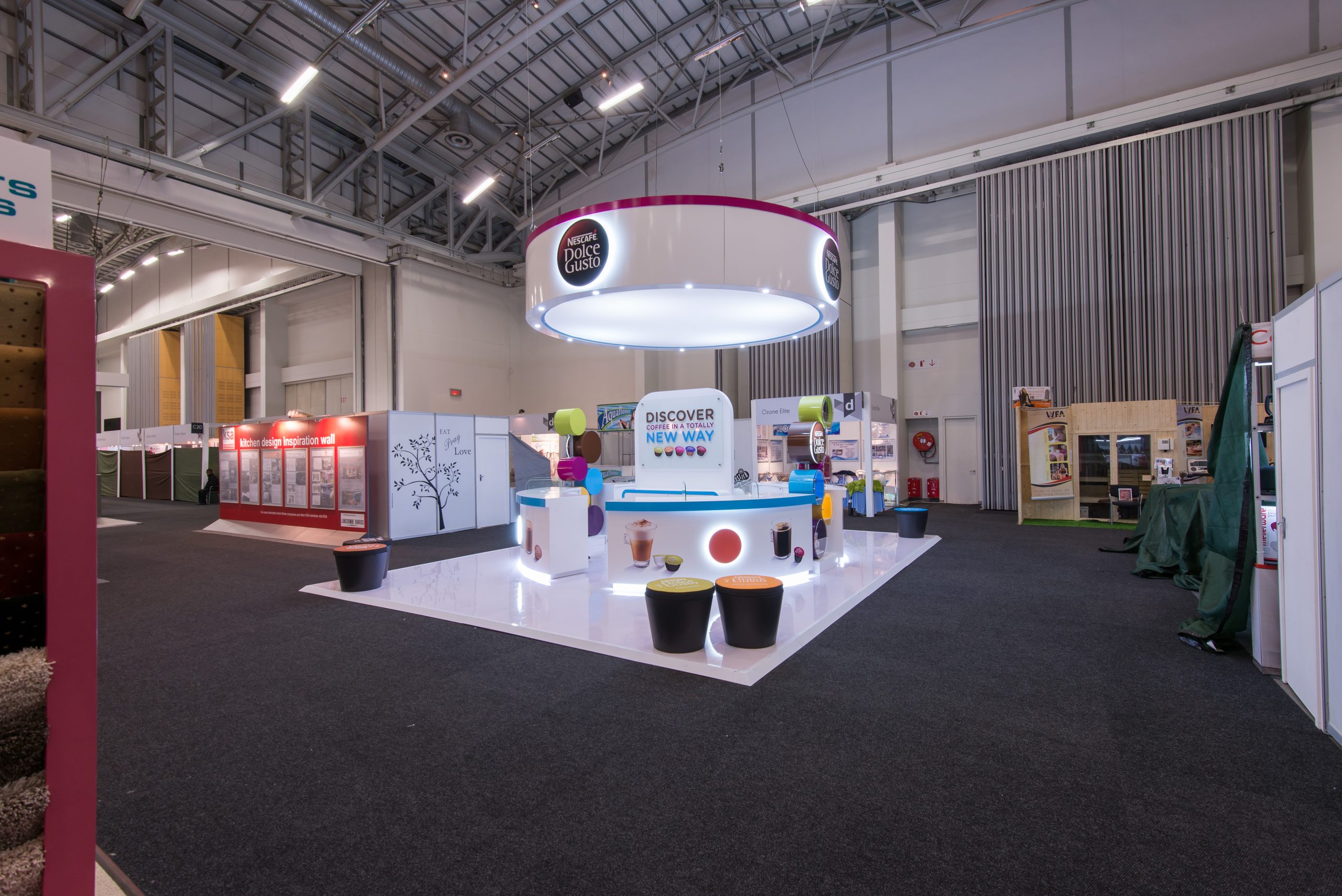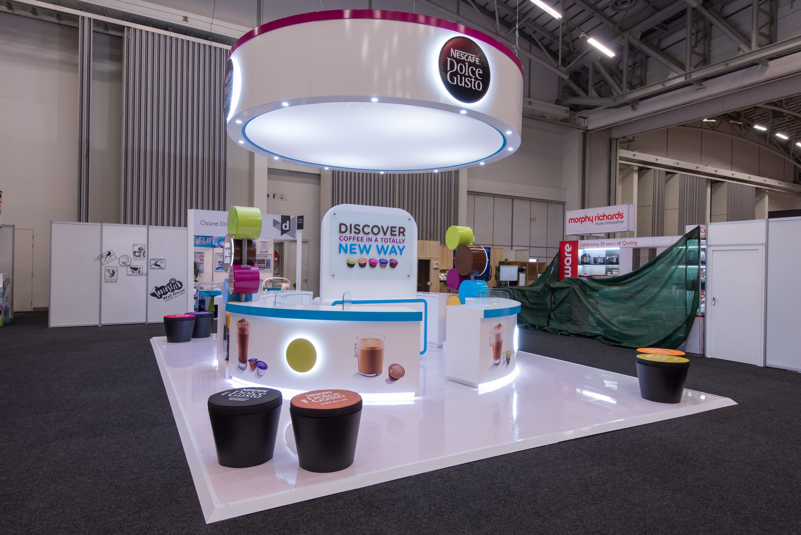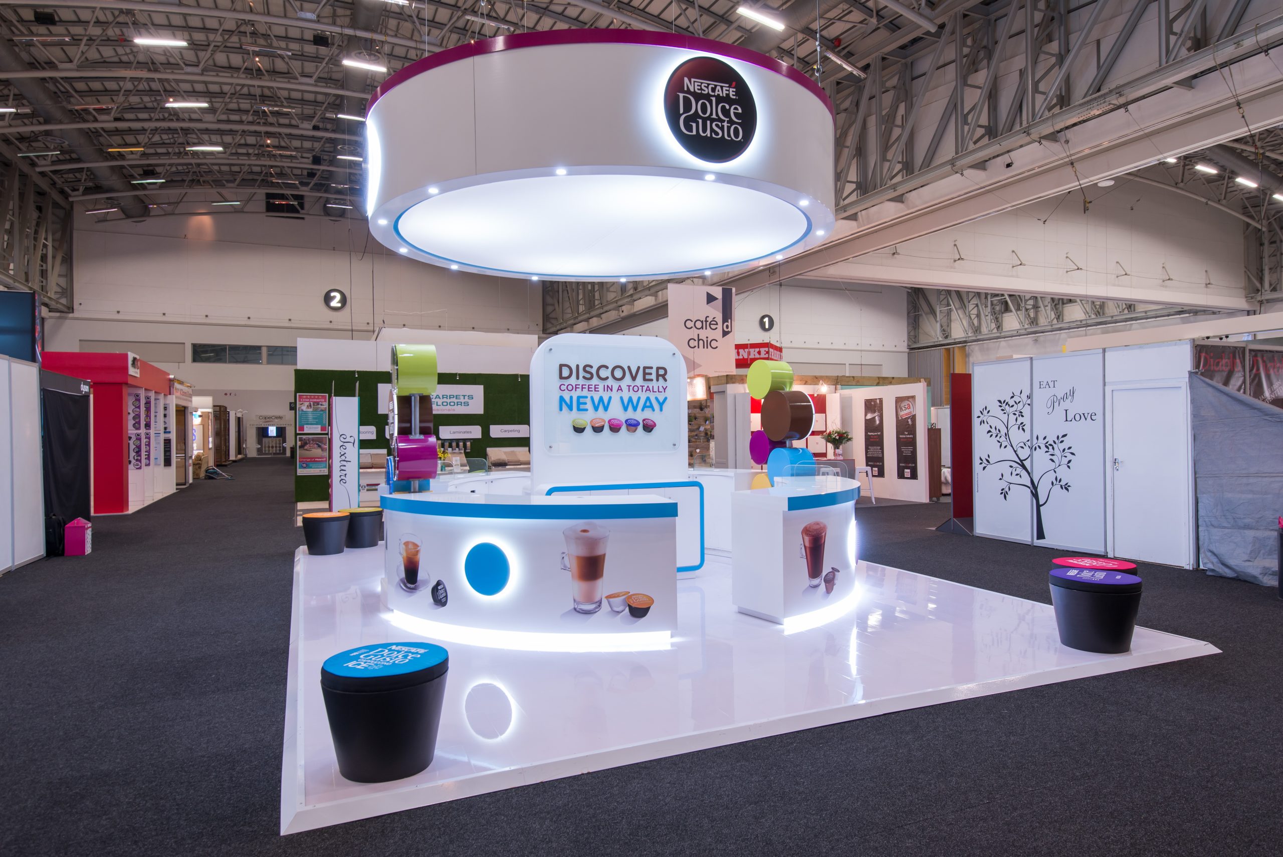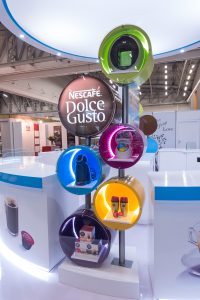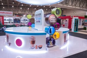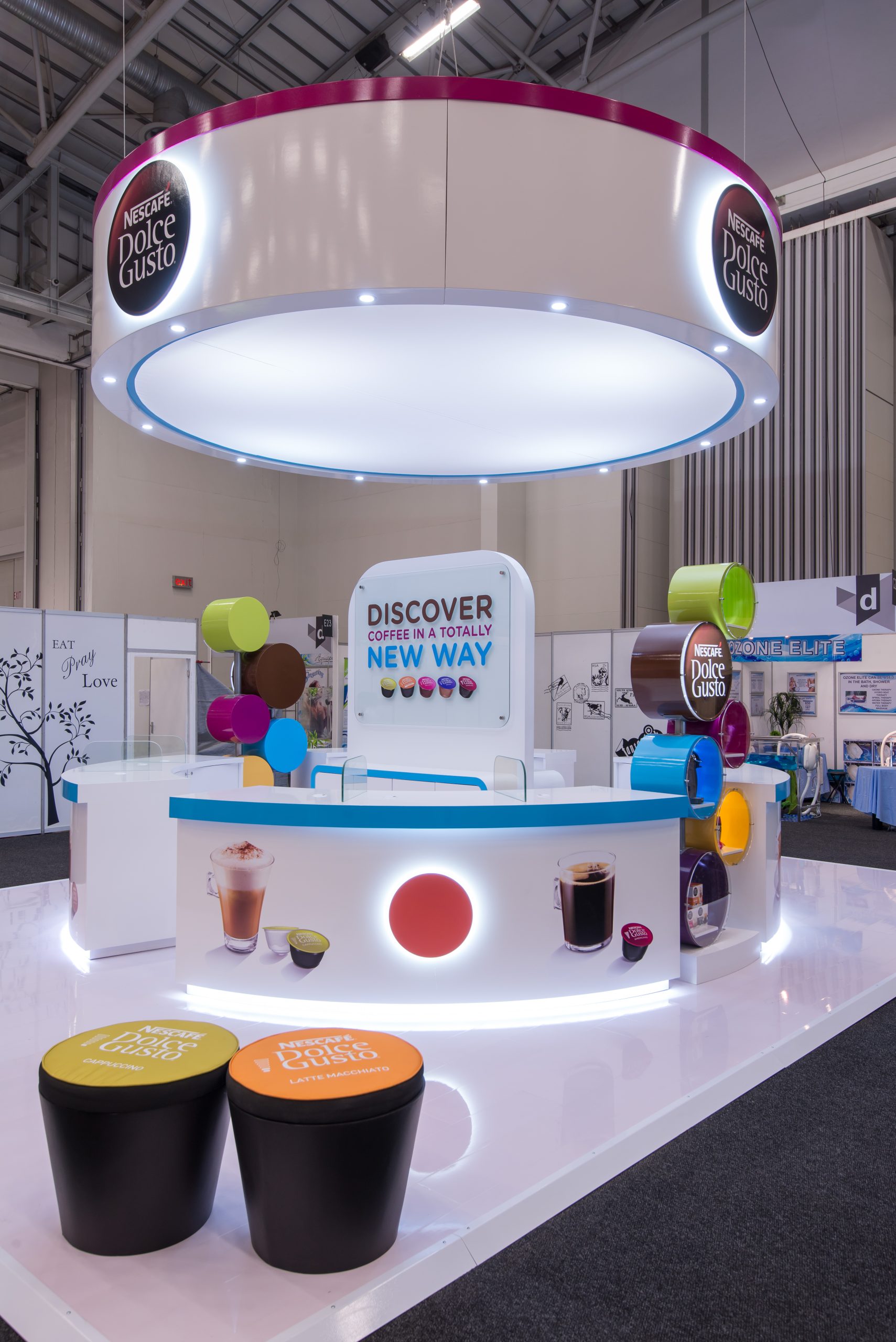 The Nestle Gusto stand’s bright and playful design was a pleasure to build. The island stand was built in a circular shape so as to allow visitors to gain access from any angel. The two custom round product display stands were made up to reflect the coffee pods as were the corner seats. The raised floor was coated with a high gloss finish as was the illuminated hanging bulkhead, giving the stand a luminous look and feel that contrasted well with the bright colours of the exhibition stand.