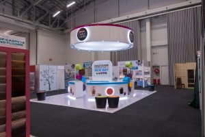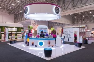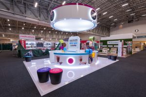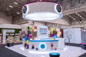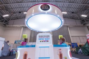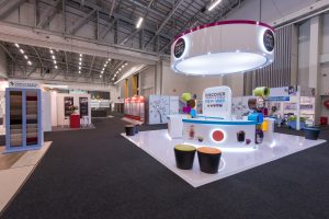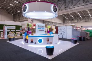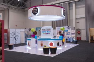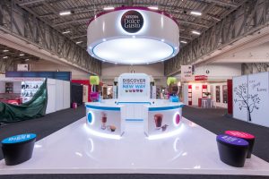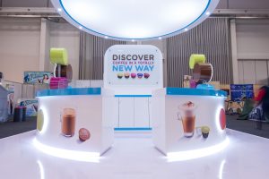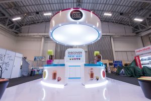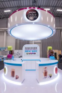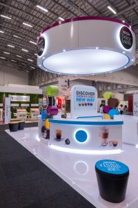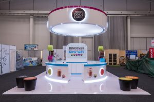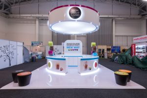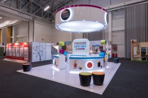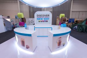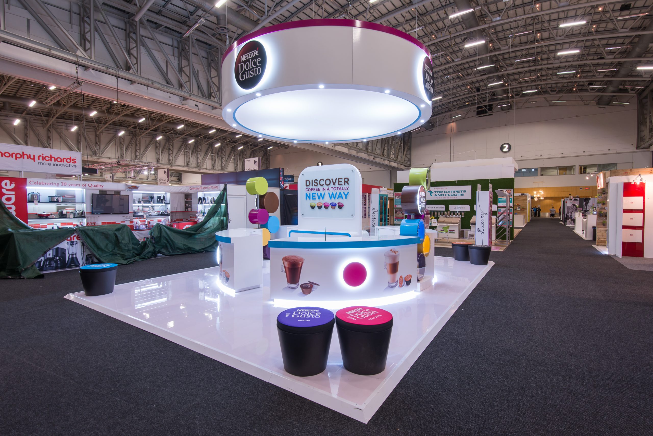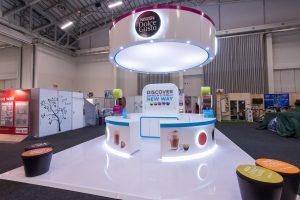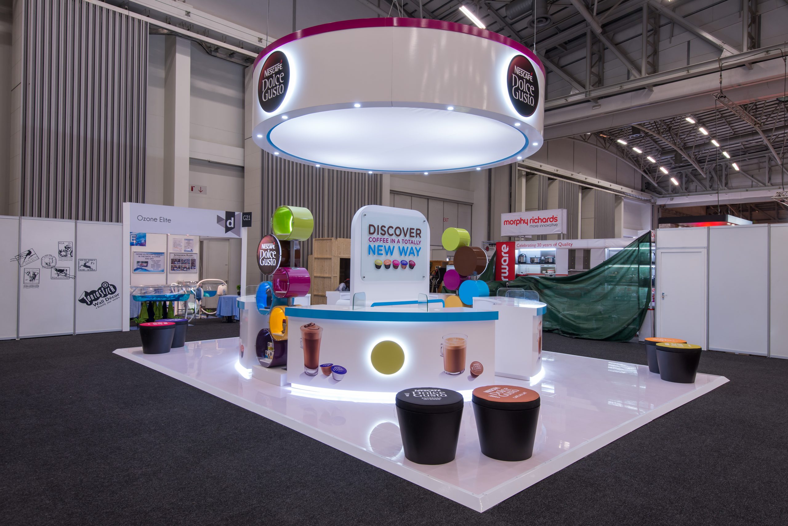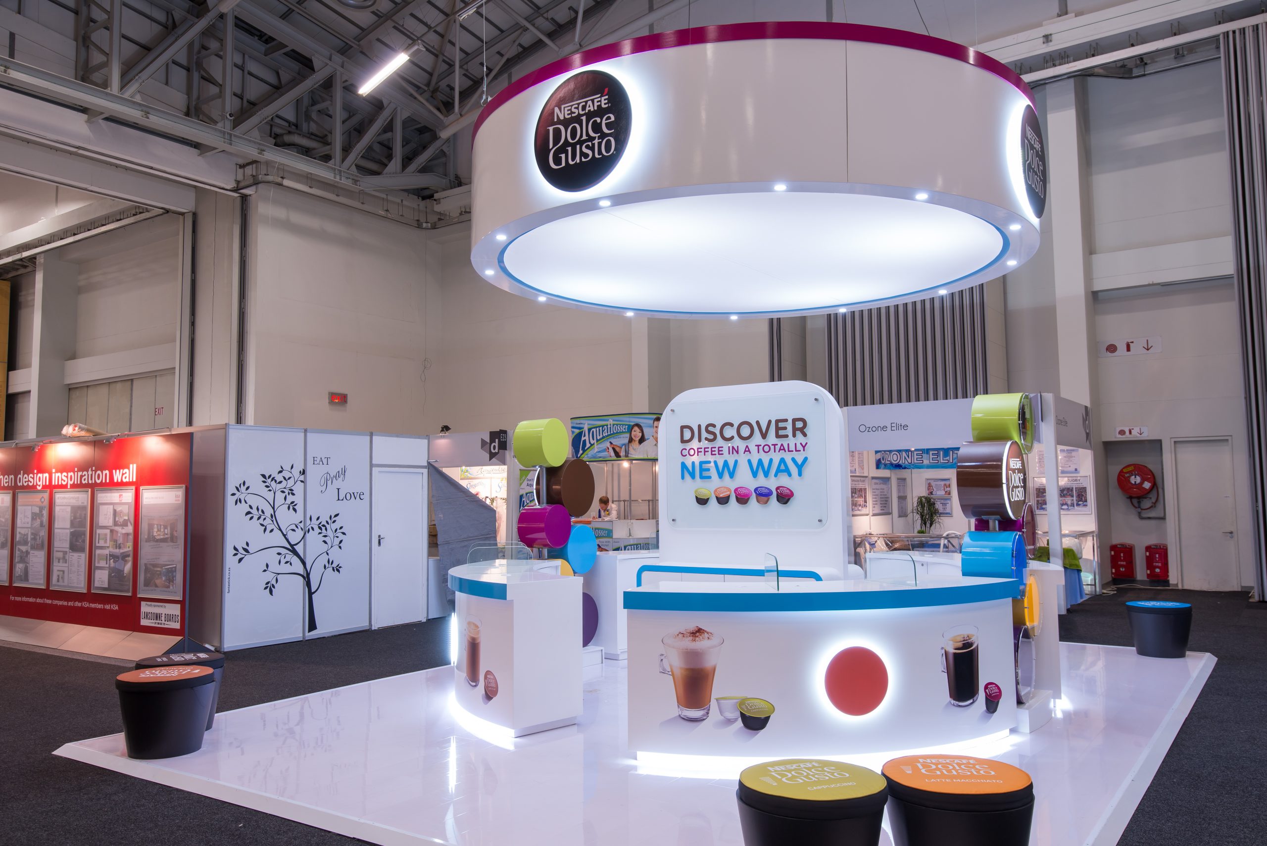 The Nestle Gusto stand’s bright and playful design was a pleasure to build. The island stand was built in a circular shape so as to allow visitors to gain access from any angel. The two custom round product display stands were made up to reflect the coffee pods as were the corner seats. The raised floor was coated with a high gloss finish as was the illuminated hanging bulkhead, giving the stand a luminous look and feel that contrasted well with the bright colours of the exhibition stand.