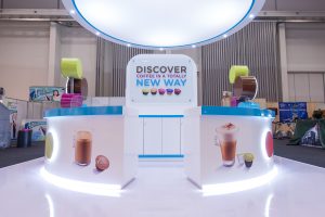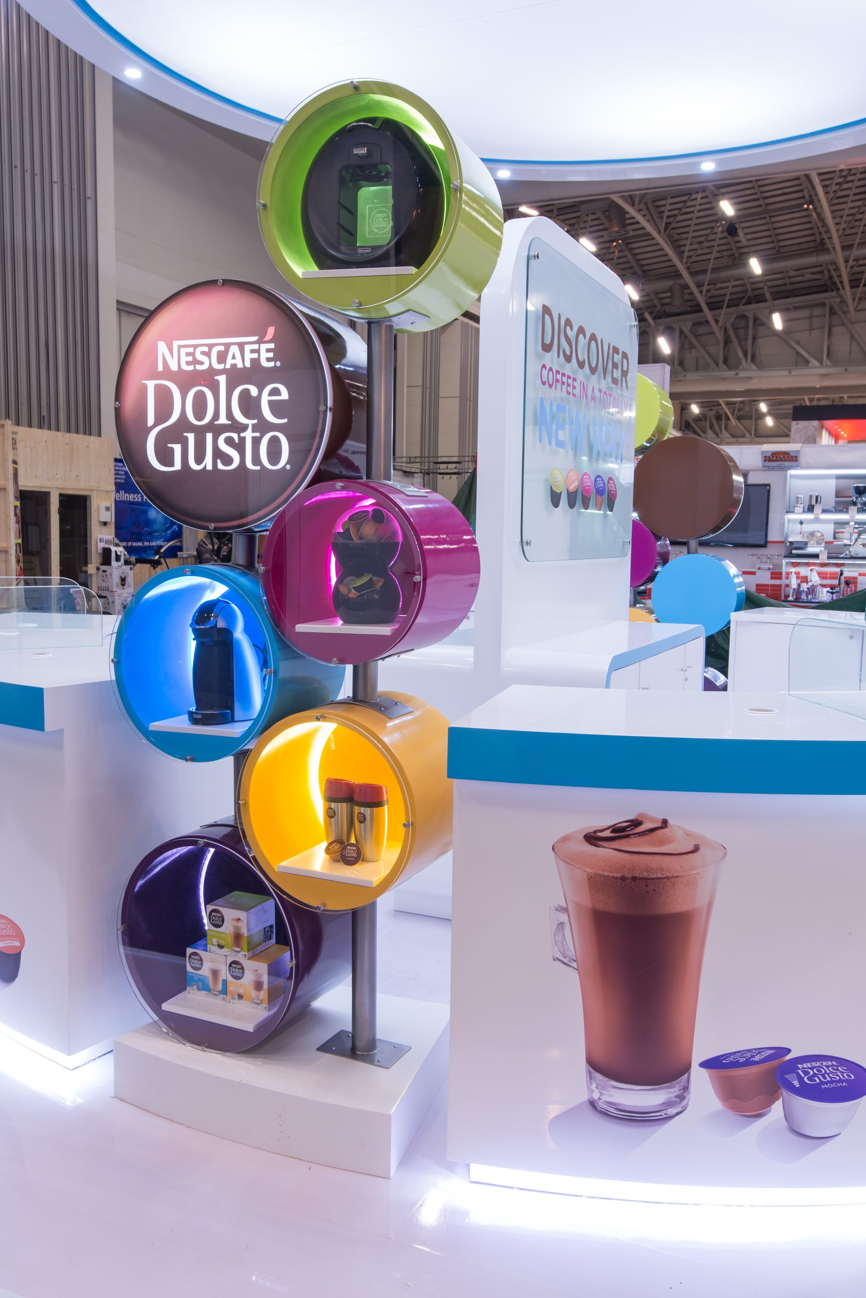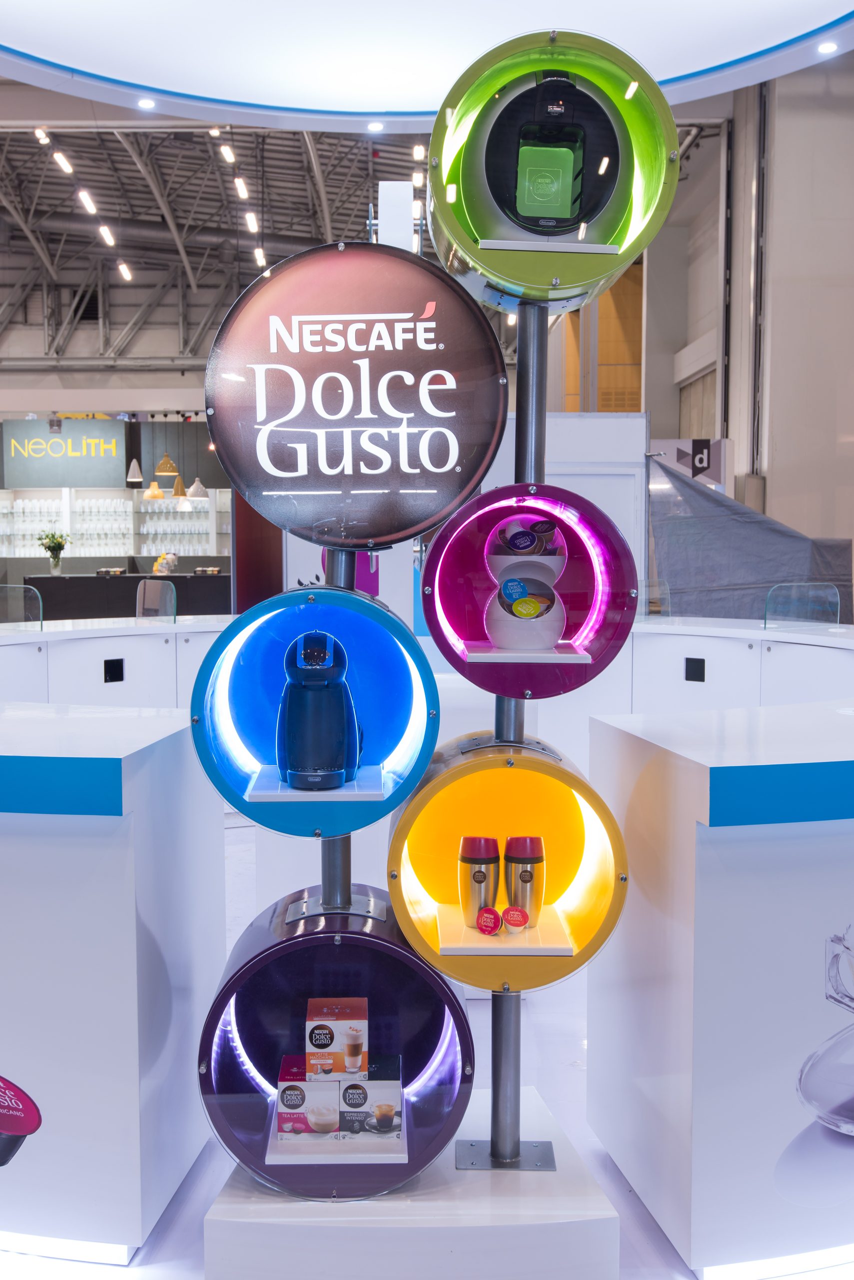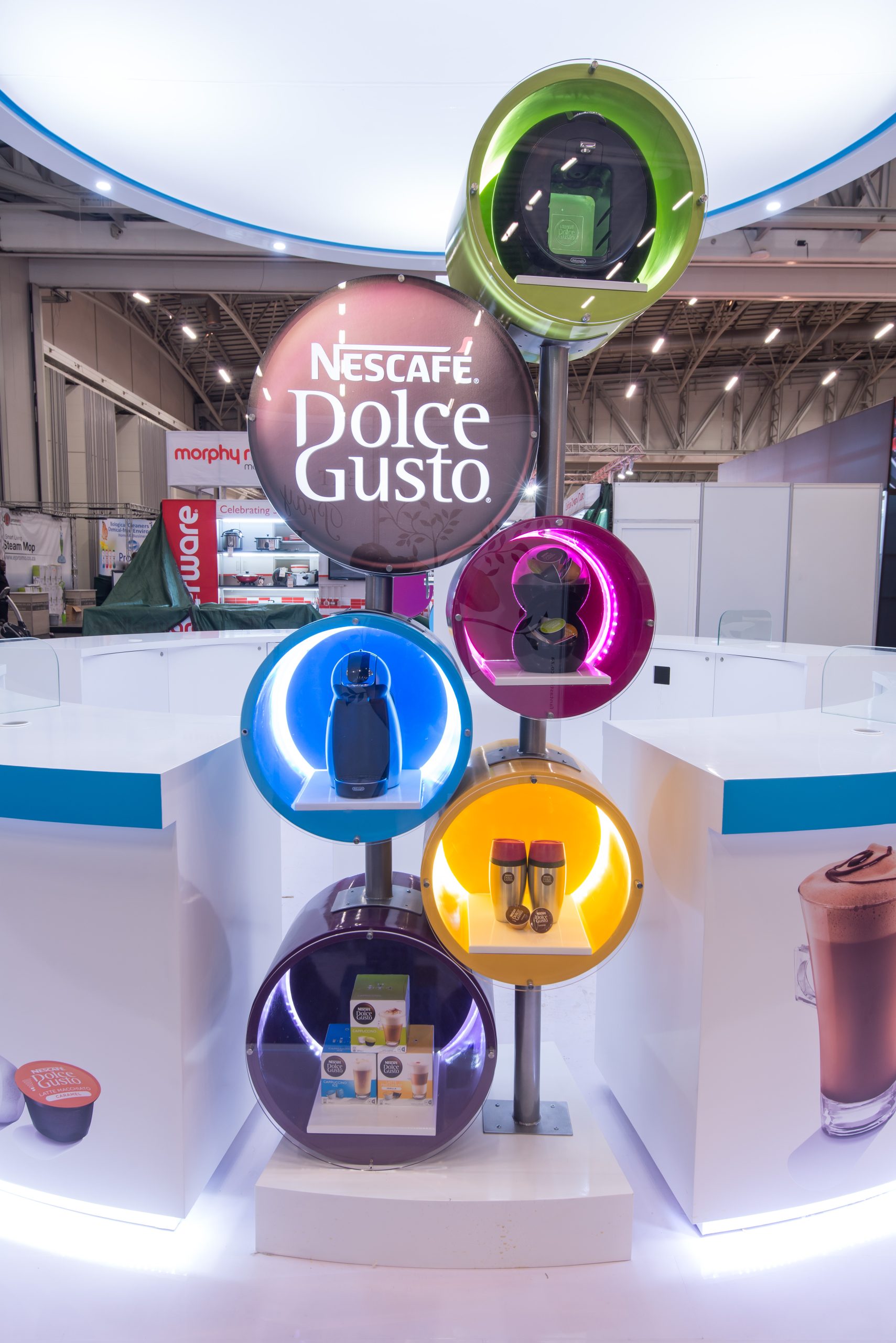 The centrepiece featured custom-designed illuminated display pods, each showcasing different product variants in a bold, colourful and highly visual format. This created an engaging focal point while clearly communicating the range and versatility of the Dolce Gusto system.
