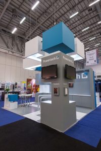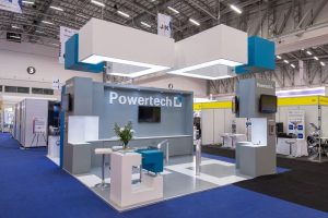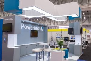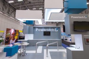 Dieser würfelförmige Insel-Messestand wurde für Powertech gebaut. Die abgehängten Wände wurden mit LED-Beleuchtung illuminiert und der Stand war an jeder offenen Wand mit LCD-Bildschirmen ausgestattet, was dem Stand ein futuristisches Aussehen und Gefühl verlieh. Die Marke wurde kühn präsentiert und frische weiße Blumen rundeten den Look ab.