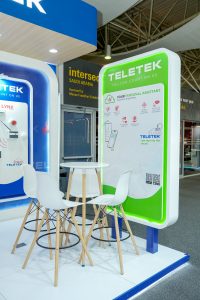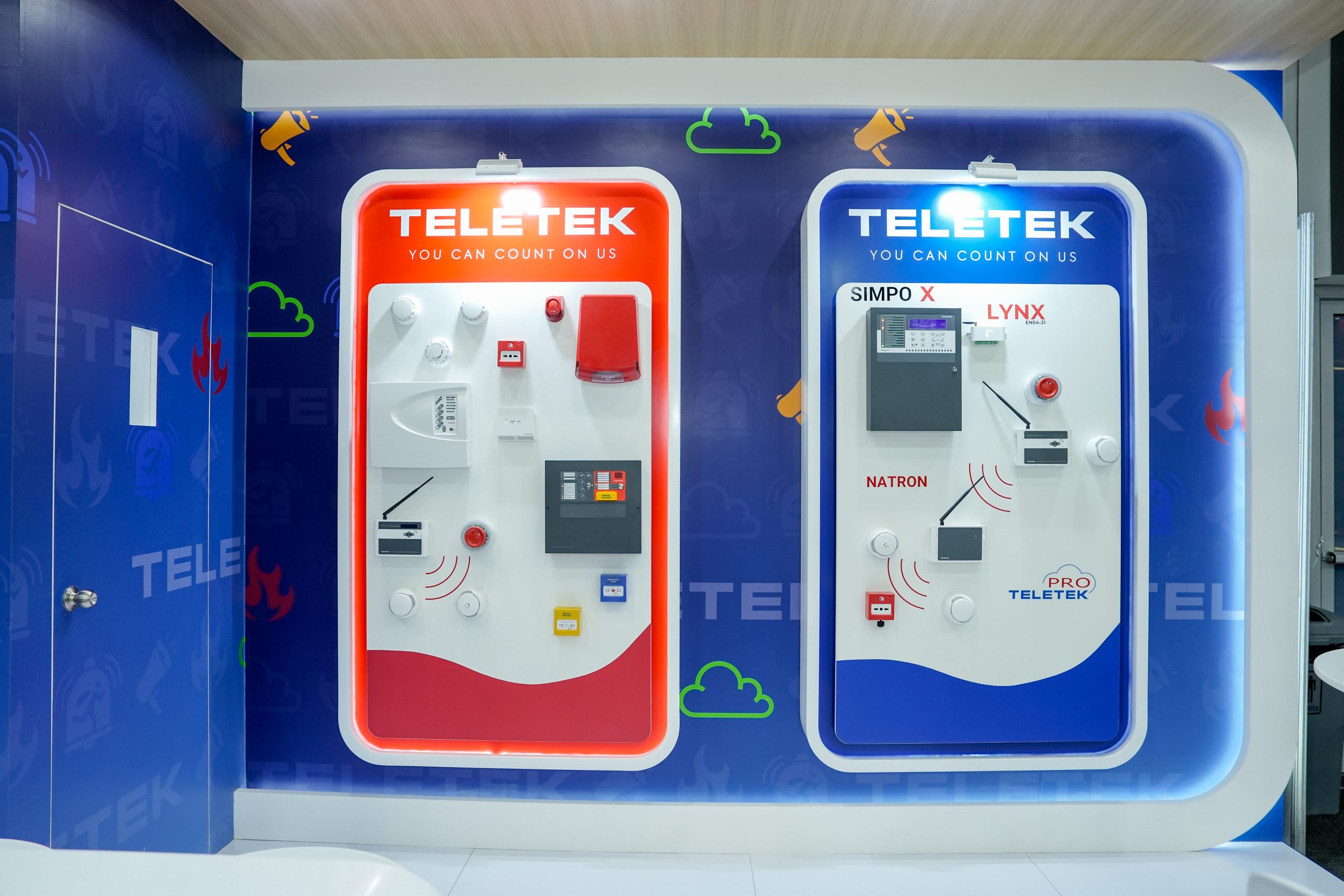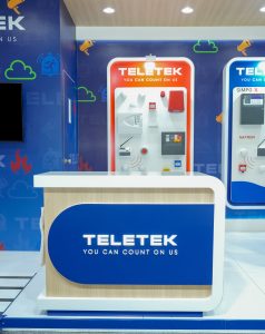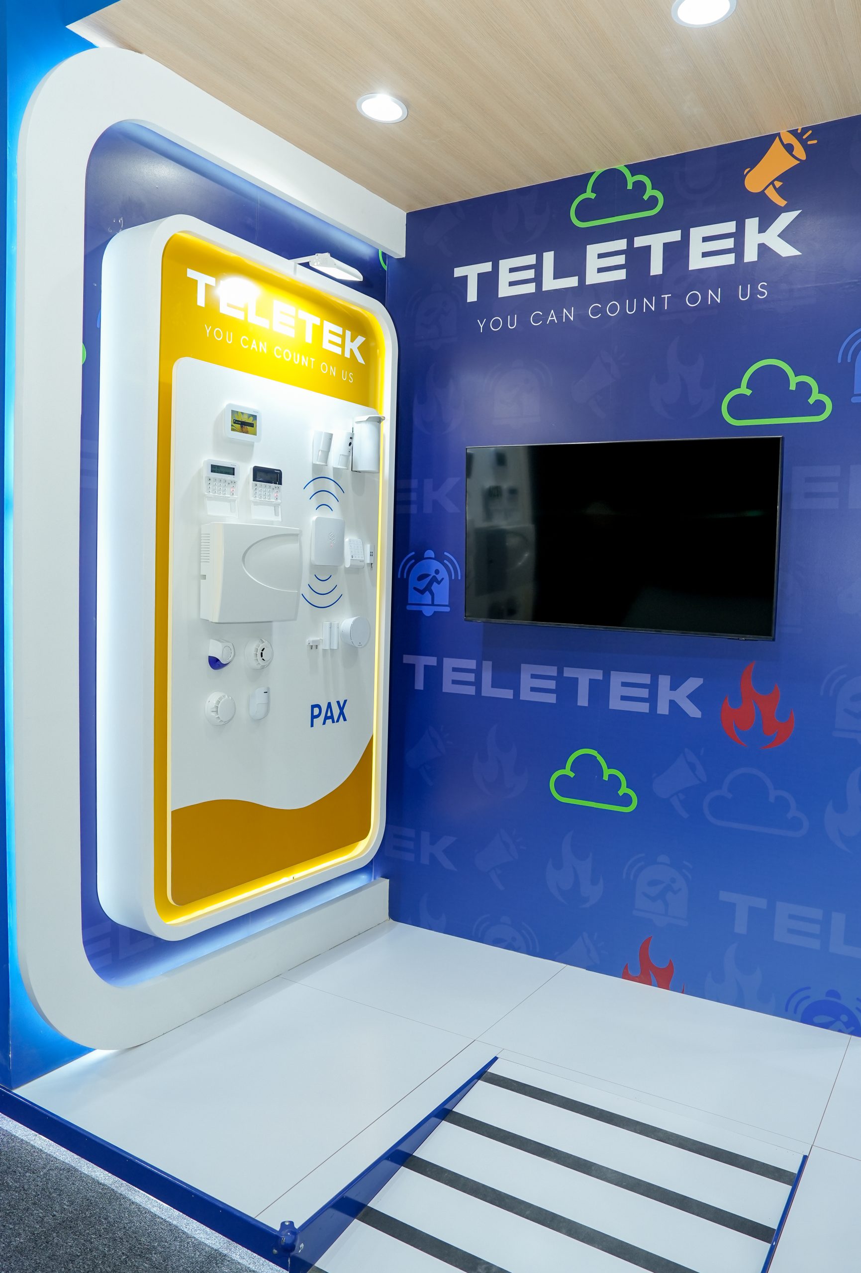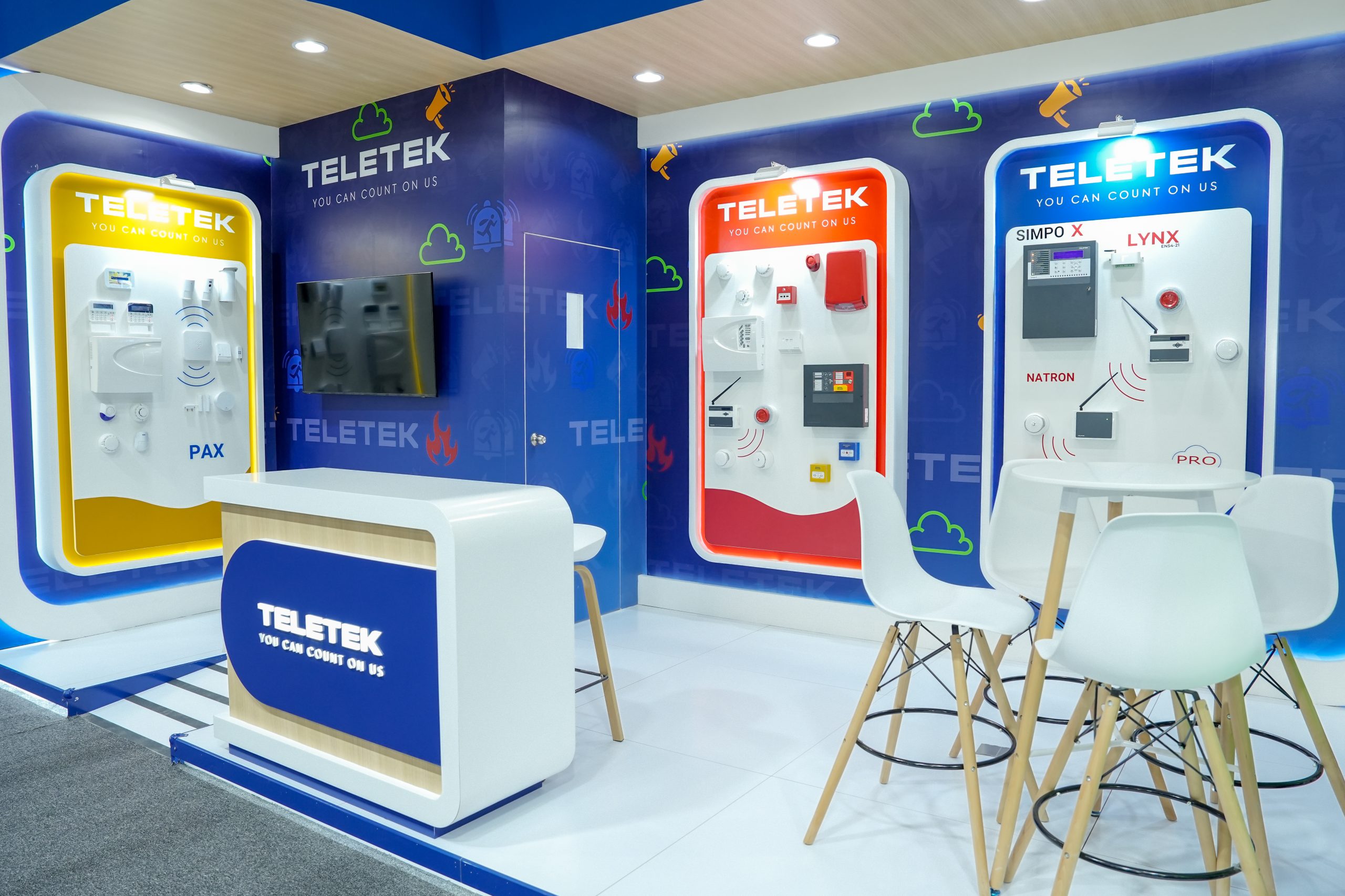 Der Ständer verfügt über eine markante architektonische Vordach mit beleuchtetem Branding, was eine starke Sichtbarkeit im gesamten Messegelände gewährleistet. Das Design konzentriert sich auf eine Reihe von beleuchtete Produkt-Display-Rahmen, wobei die Sicherheits- und Brandmeldesysteme von Teletek in einer strukturierten, leicht zugänglichen Aufmachung präsentiert werden.