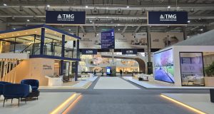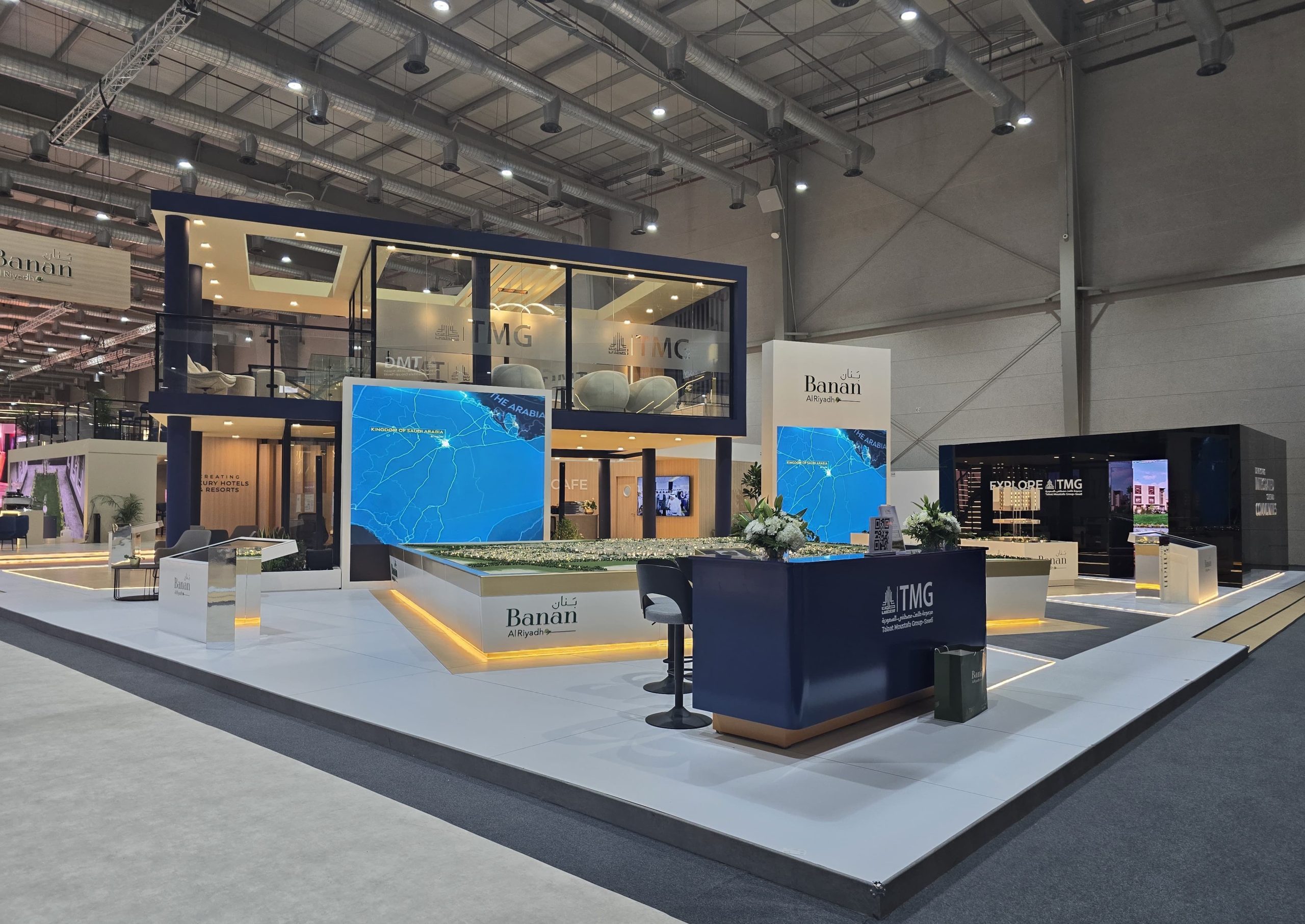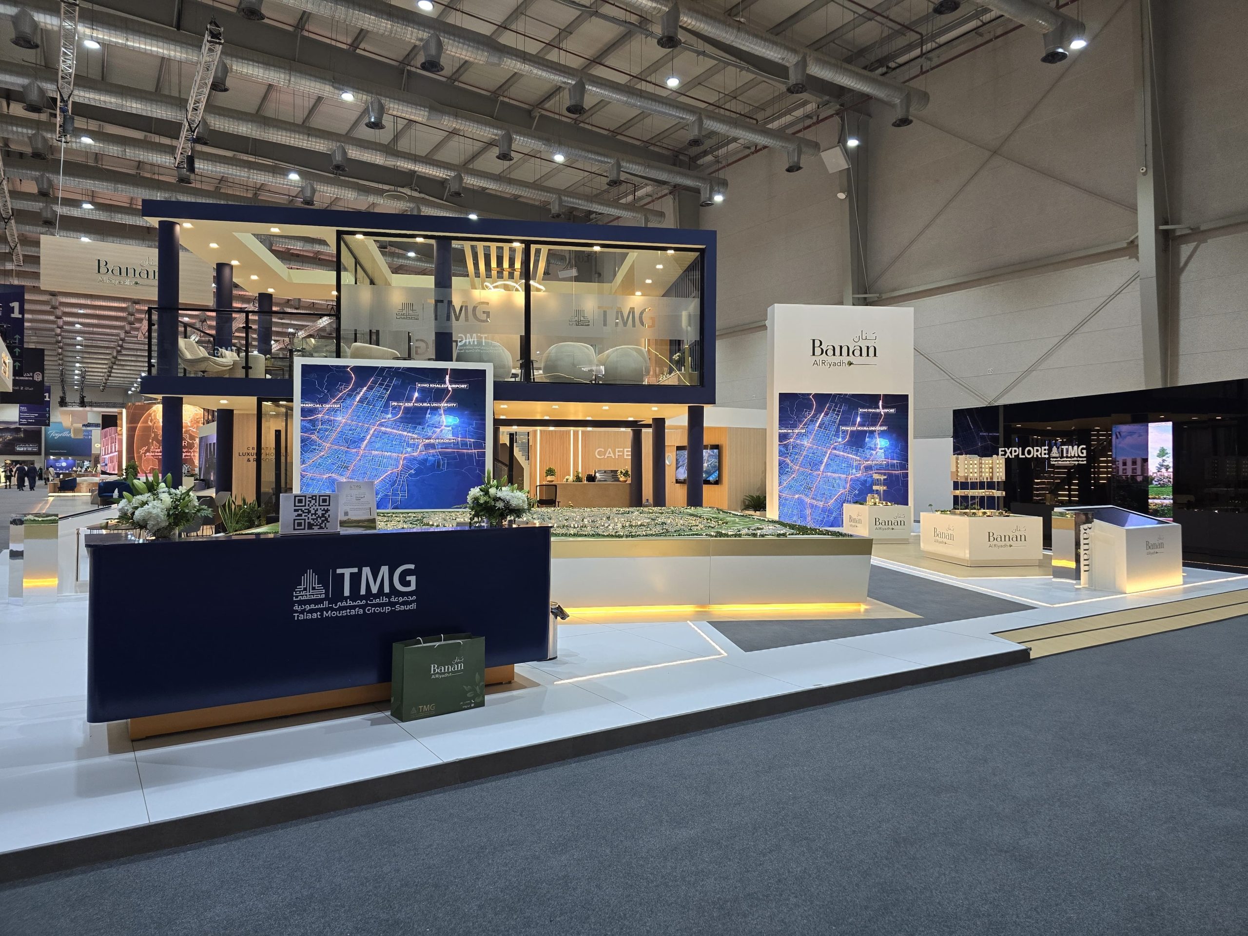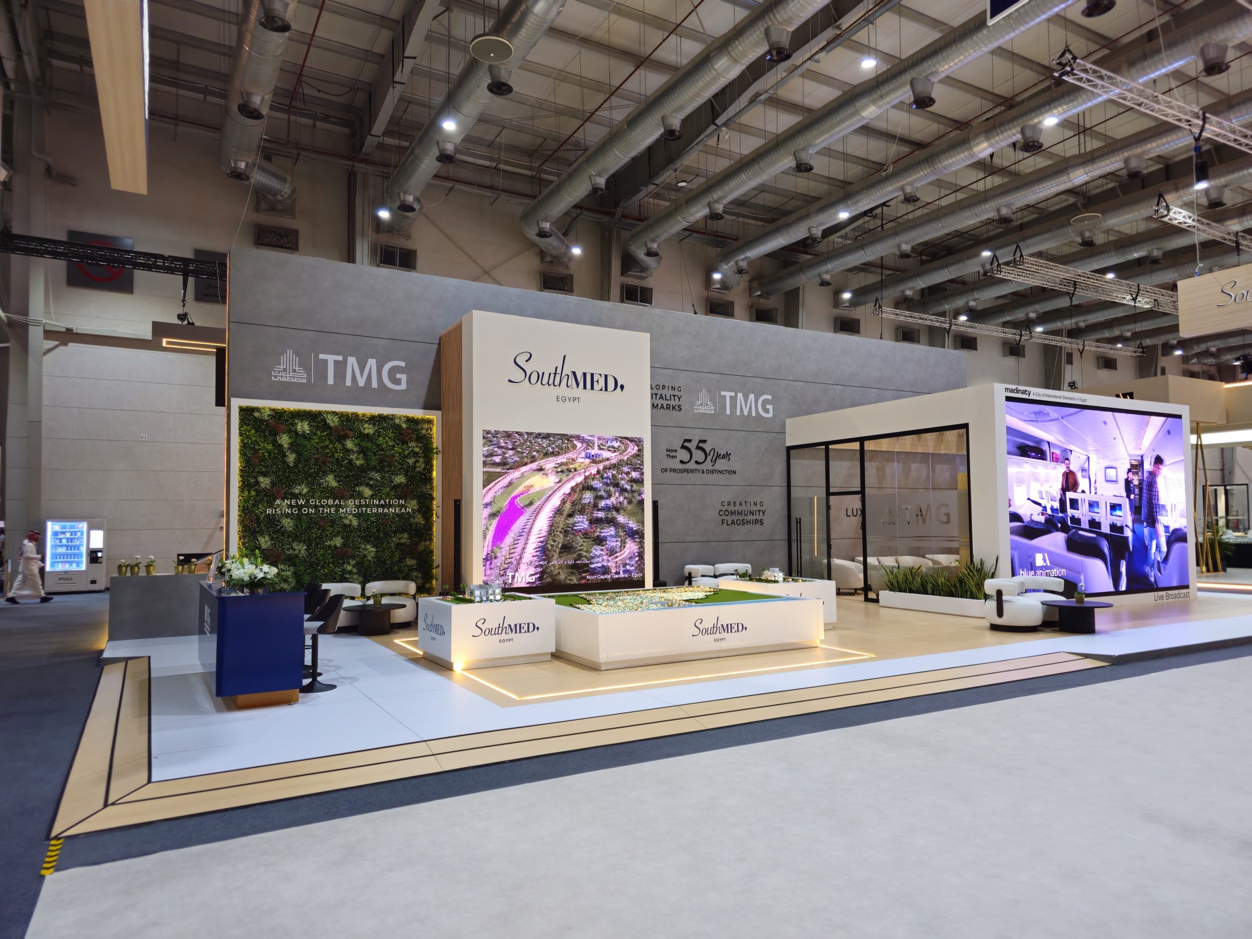 Diese Großer zweistöckiger Messestand für TMG (Talaat Moustafa Gruppe) an Stadtlandschaft 2024 wurde entwickelt, um die Position der Marke als führend in ... widerzuspiegeln Immobilienentwicklung und integrierte Gemeinschaften.