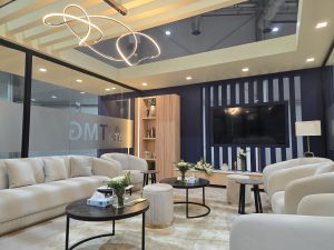 Der Ständer kombiniert architektonische Präzision mit erstklassiger Gastfreundschaft, mit einem klaren, modernen Design, das durch... weiche integrierte LED-Beleuchtung, hochwertige Oberflächen und natürliche Texturen. Ein prominenter Zentrale Masterplan-Anzeige verankert den Raum, unterstützt durch großformatige digitale Bildschirme und immersive visuelle Inhalte, um wichtige Entwicklungen zu präsentieren.