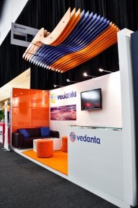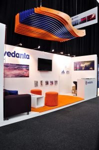 Vedanta Resources ist eines der größten diversifizierten Rohstoffunternehmen der Welt mit Beteiligungen an Zink, Blei, Silber, Kupfer, Eisenerz, Aluminium etc. Dieser Kunde beauftragt 369 mit dem Aufbau seines Messestandes für die Mining Indaba. Eine wunderschöne, fließende Skulptur, die das Logo des Kunden darstellt, hängt darüber, während weiche Teppiche und elegante Möbel die Farben der Marke Vedanta zum Leben erwecken.